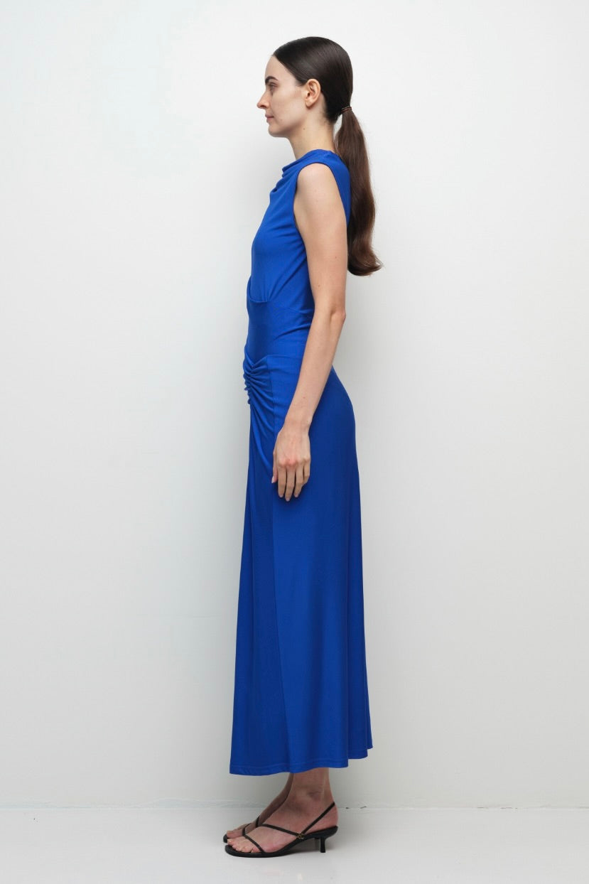 The Acacia Draped Jersey Midi Dress in Royal Blue. This sleeveless midi dress in draped jersey features artful gathering and a fluid silhouette that exudes understated elegance.