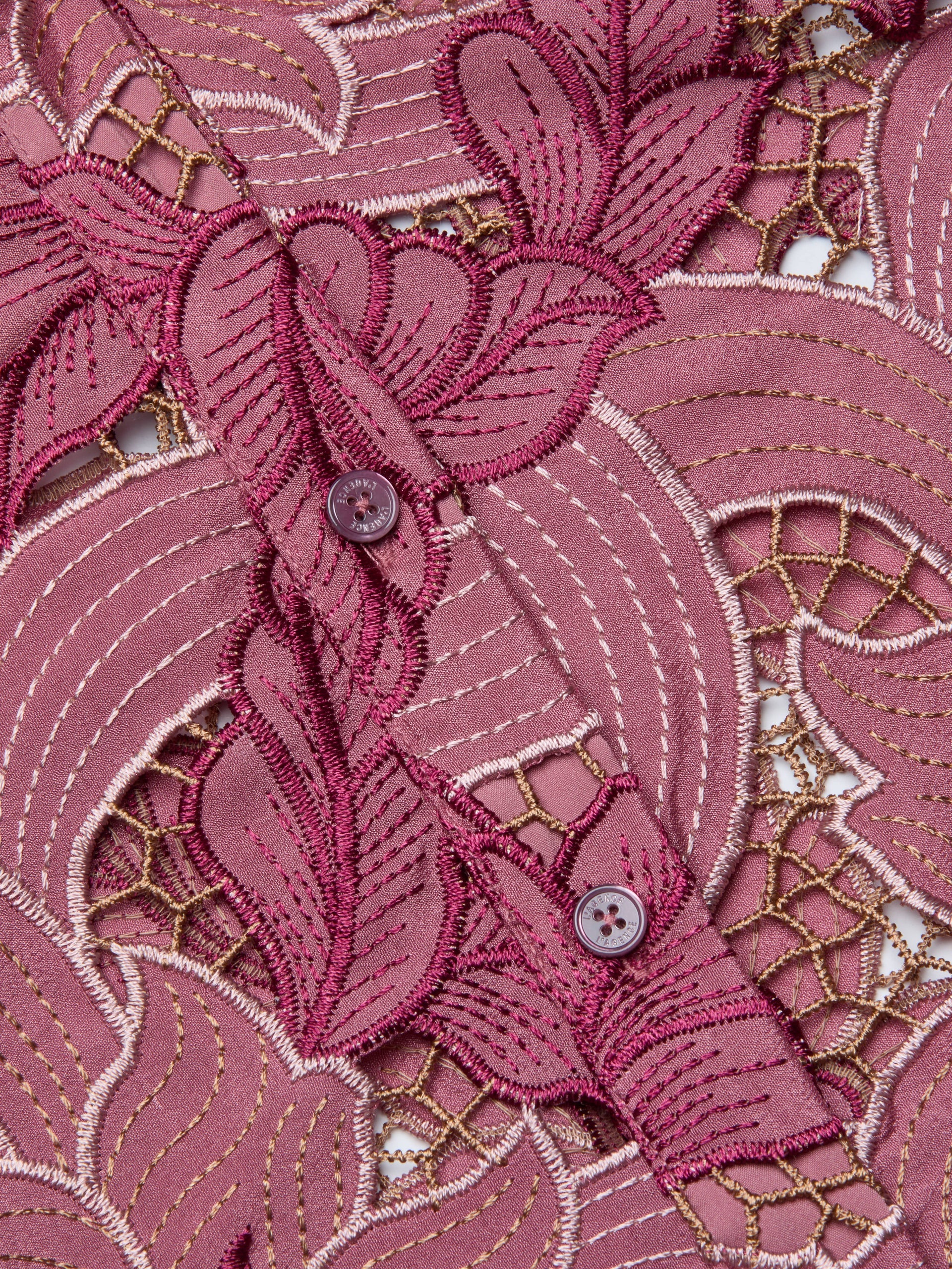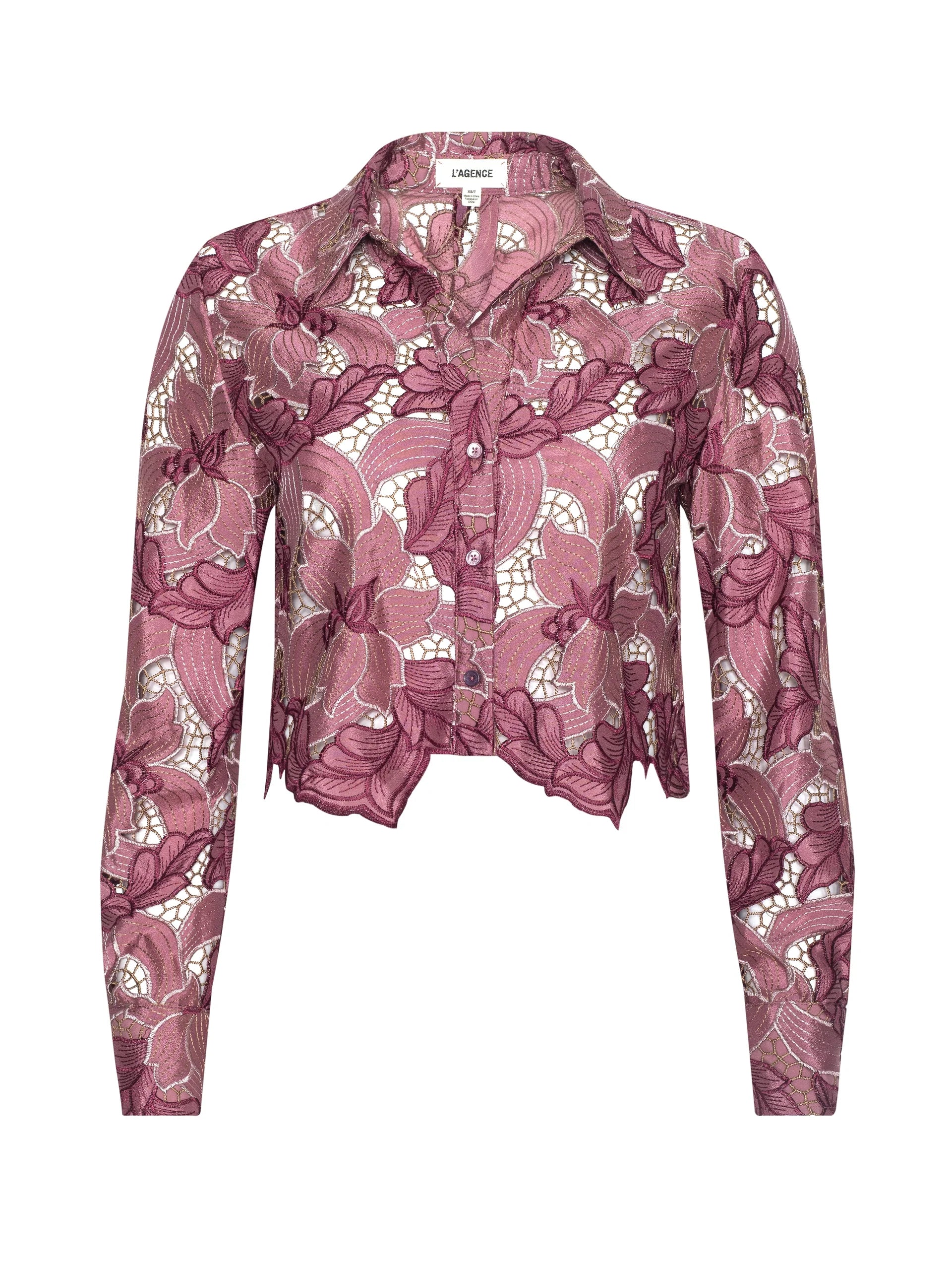 The Akemi is a cropped button-up shirt featuring bold floral motifs in an embroidered eyelet fabric. Finished with a scalloped hem, it’s a statement piece that blends feminine detail with modern edge. Now in mauve.