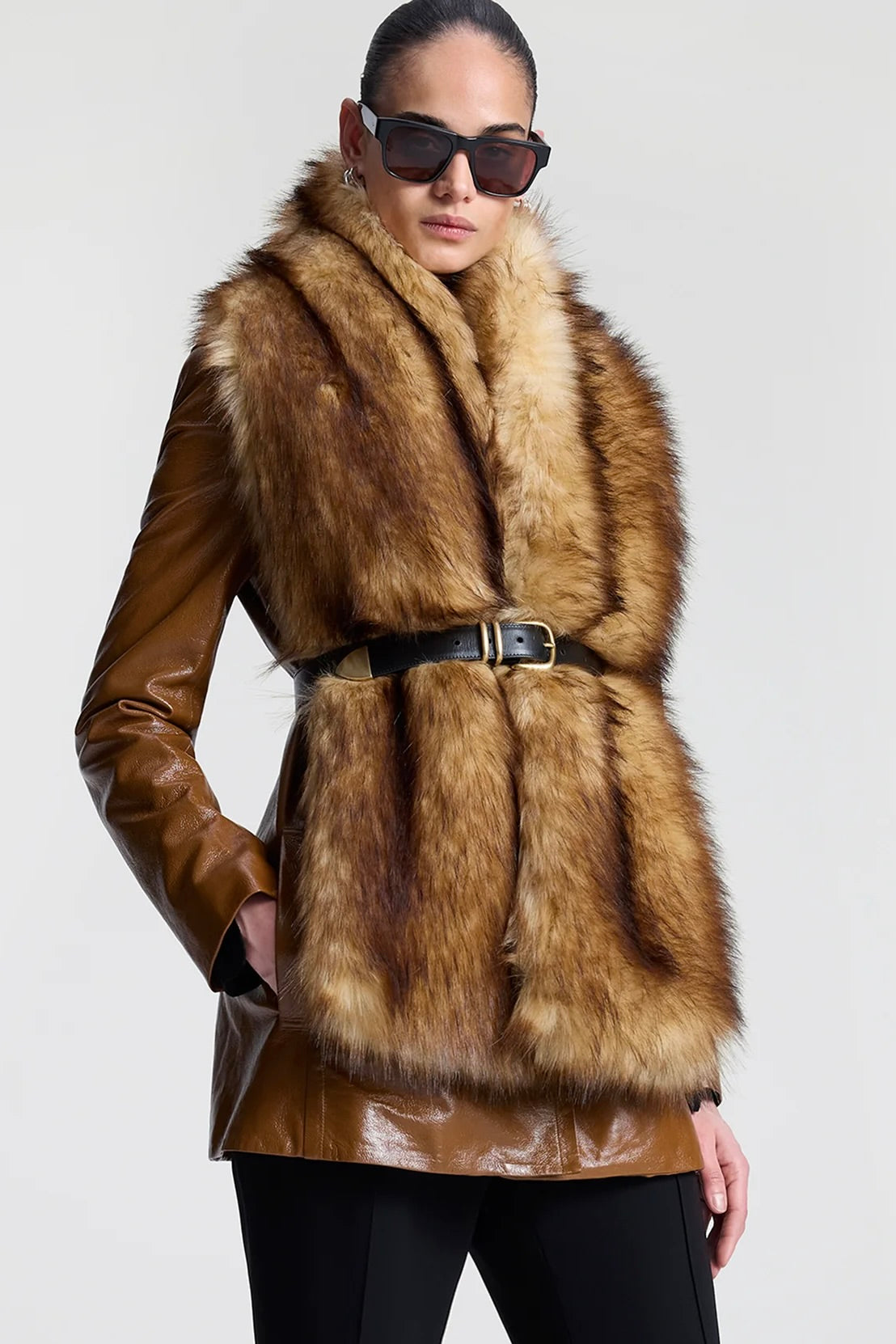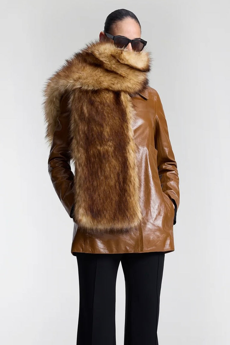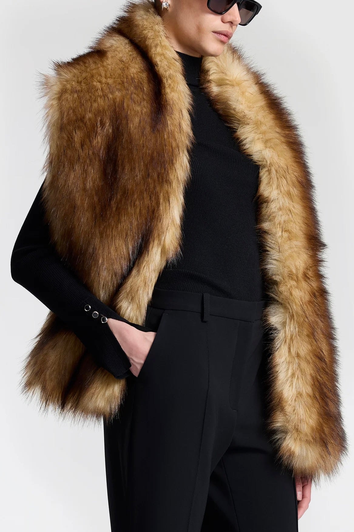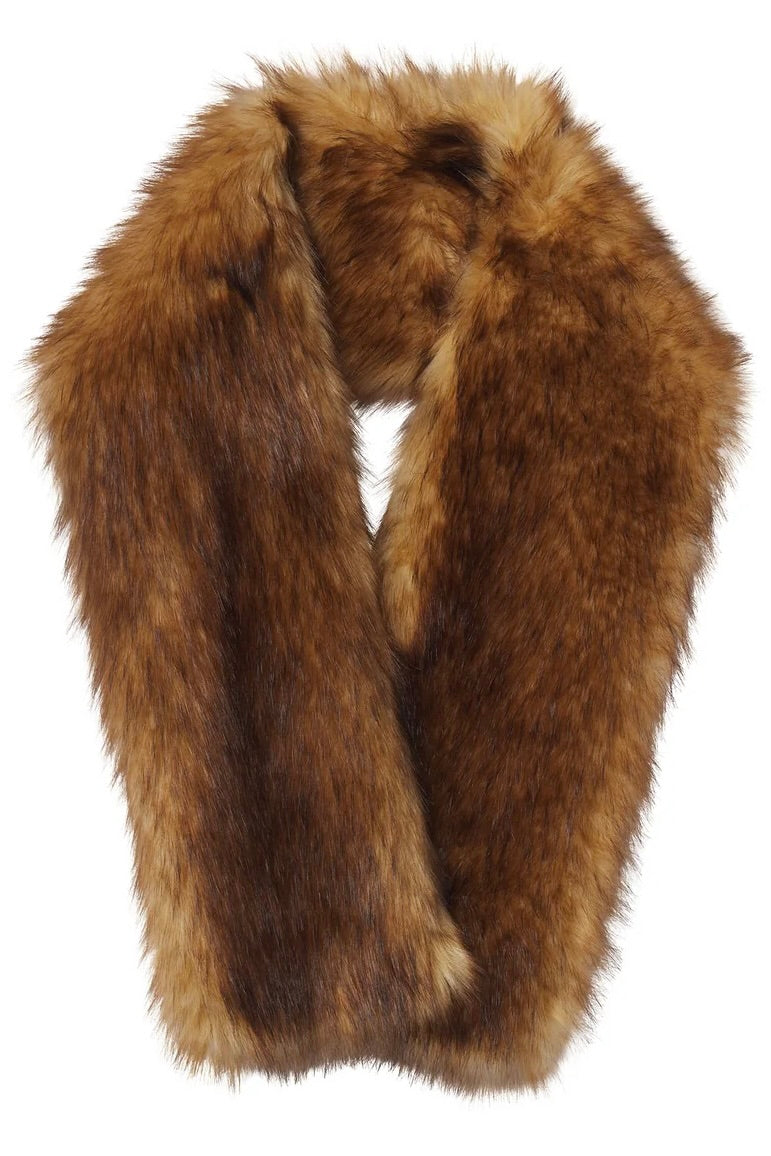 - The Ava Scarf is crafted from plush faux fox fur in a warm brown palette, accented with soft black striping for depth and dimension.