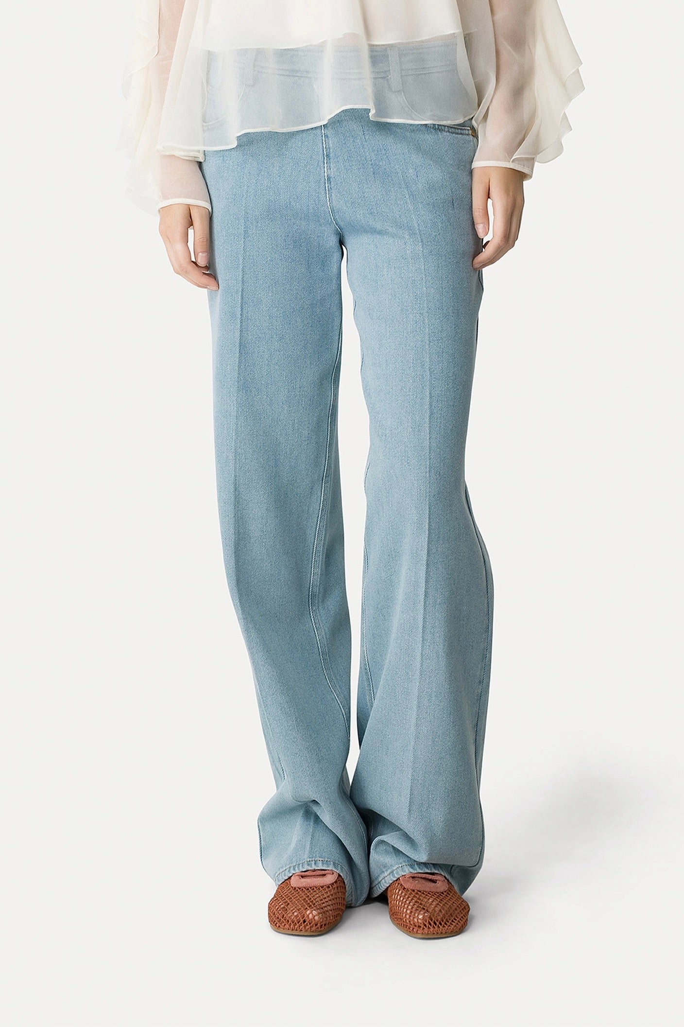 crafted from substantial, tactile cotton bull, these high—waisted pants feature a flat—front construction. feminine and relaxed, with a viridis patch on the back and metallic rivets, the five—pocket trousers have a straight leg for a sleek silhouette. contrasting topstitching in tobacco thread completes the look.
