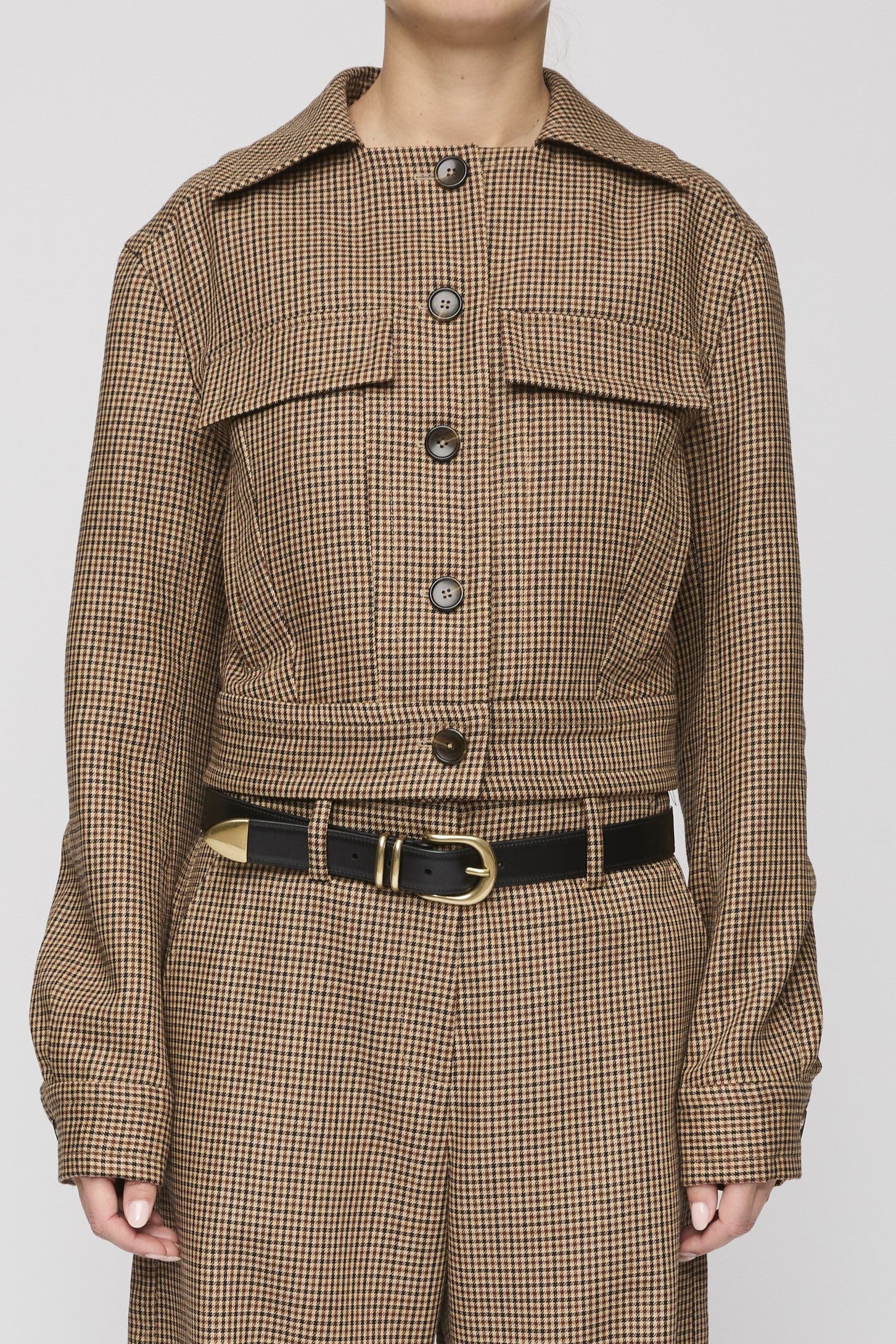 A shrunken silhouette with square neckline and tonal buttons. Crafted in a wool micro check, woven by an Italian mill dating from 1859.