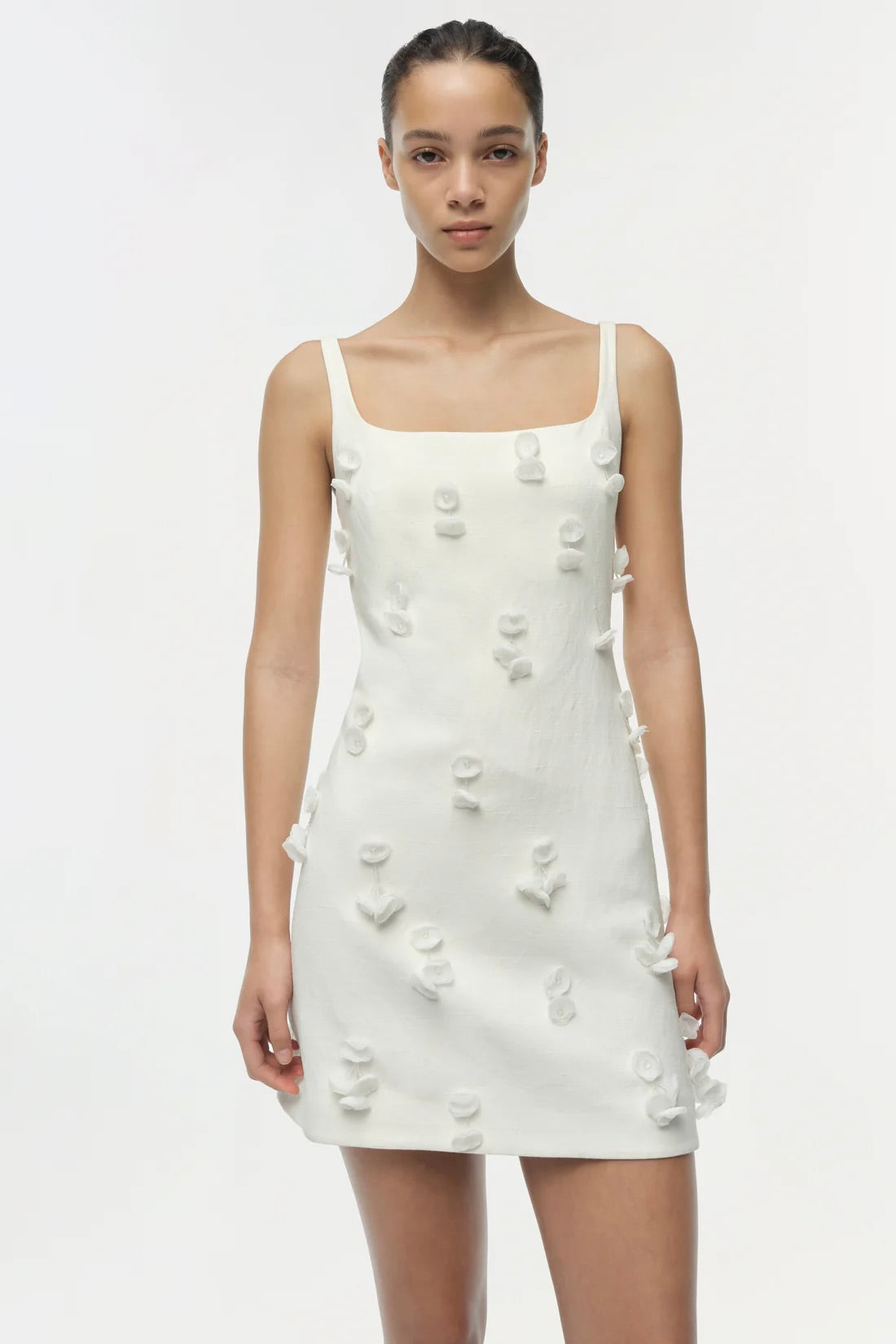 The Cailinn Mini Dress in White. Crafted in a linen blend, this strapless mini dress features a sqaure neckline and structured bodice adorned with dimensional floral appliqués. A piece that blends architectural precision with soft femininity.