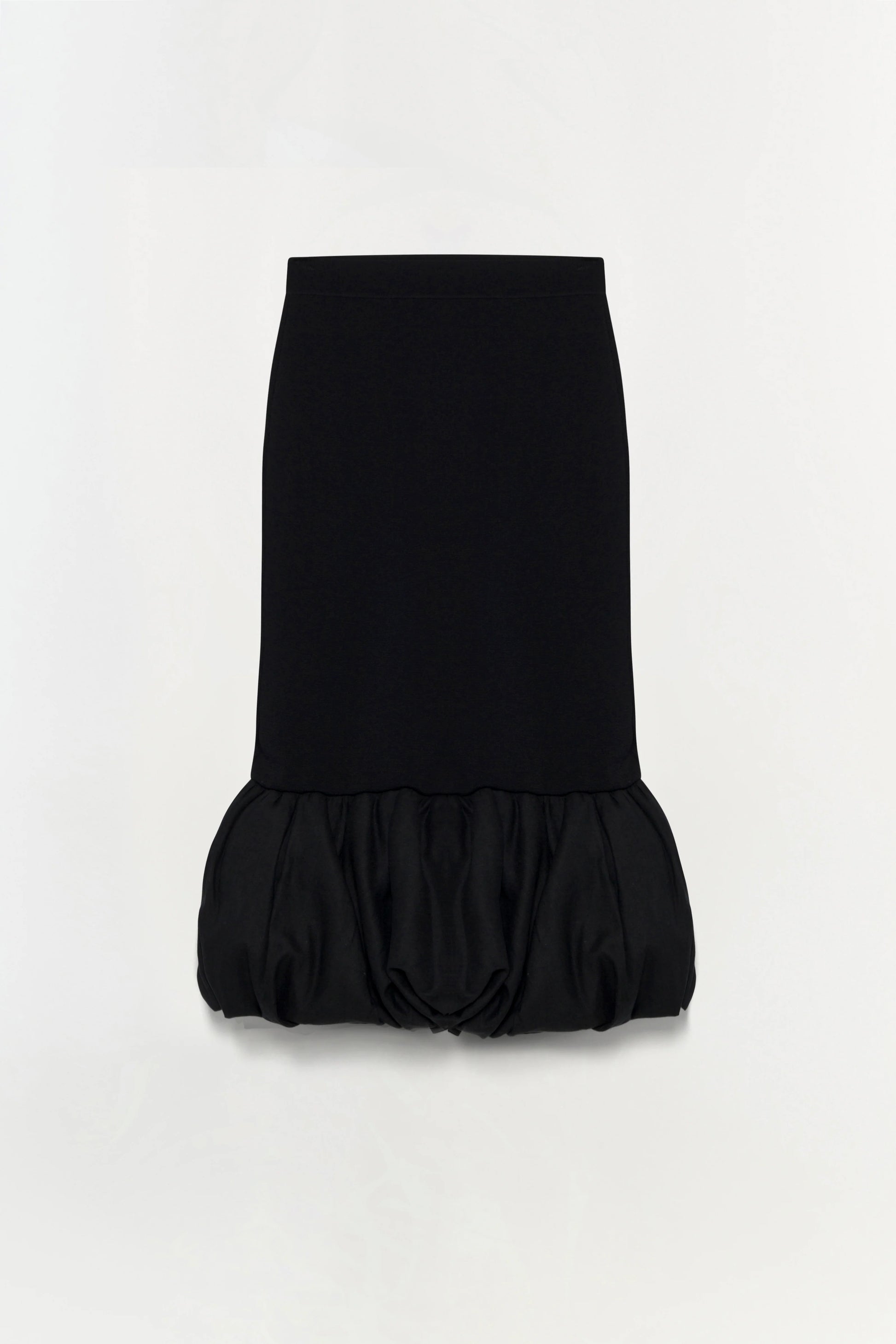 The Camille Skirt in Black. Crafted from a linen knit combo, this midi merges effortless structure with fluid movement. A softly sculpted silhouette finished with a voluminous ruffled hem adds a touch of modern drama.