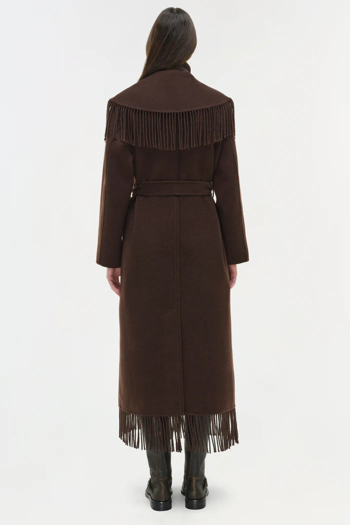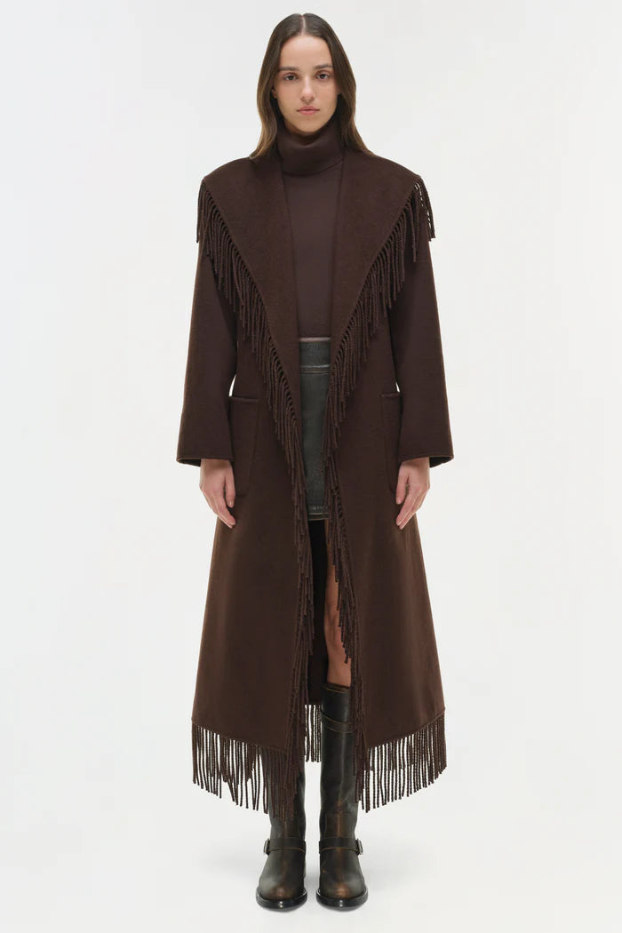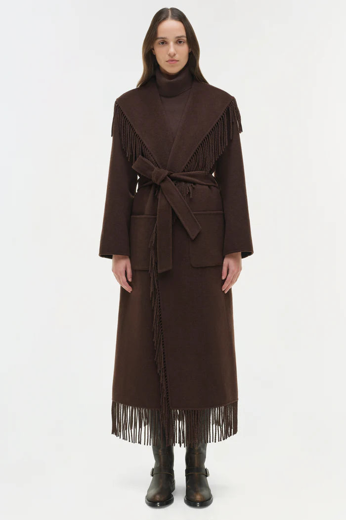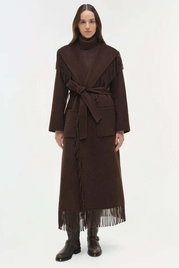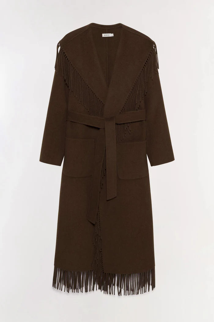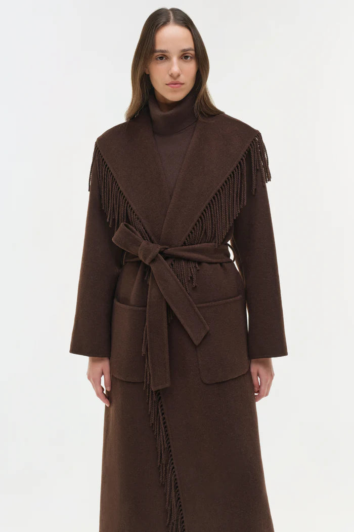 A robe coat featuring an exaggerated foldover neckline, front pockets, tie-front closure, and fringe hem.