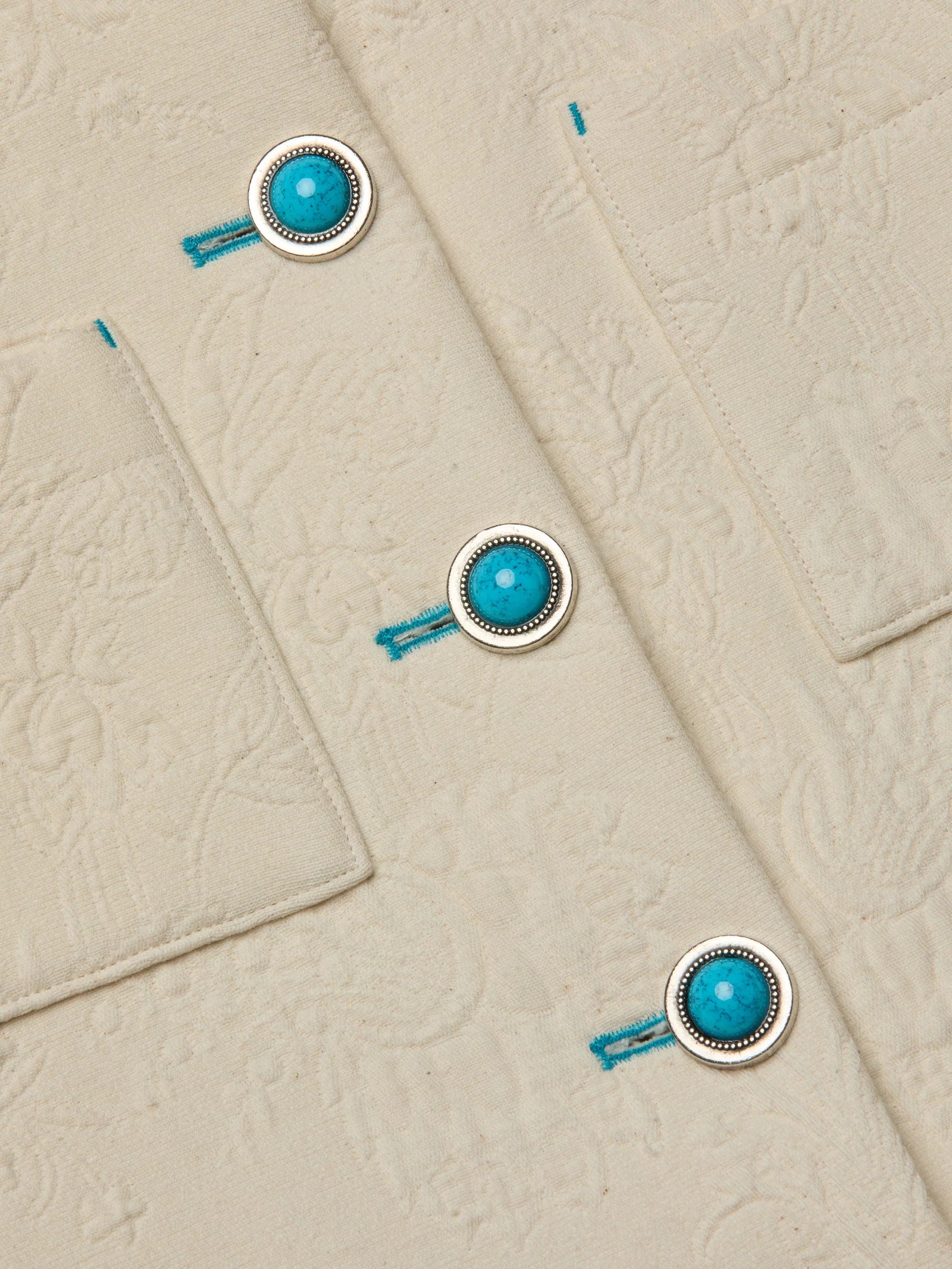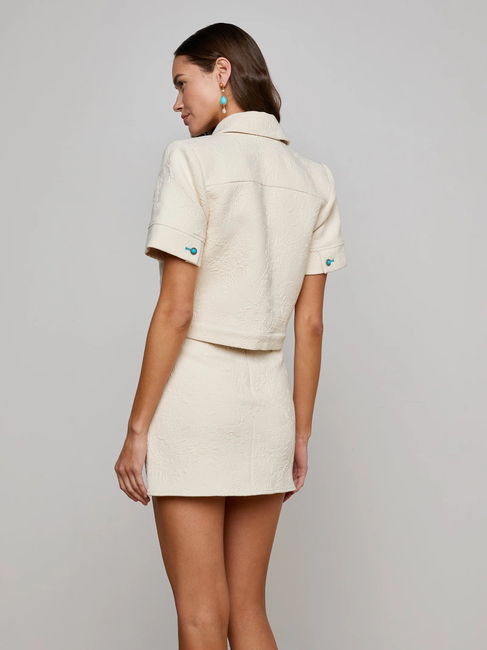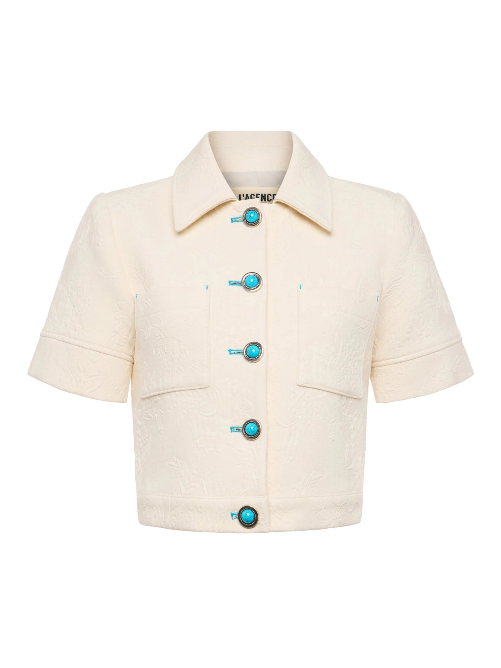 Classic, but make it fun. The Chita is a cropped, short-sleeved jacket crafted from a unique floral jacquard with texture and dimension. Turquoise buttons and topstitching add a pop of color. Wear alone or layered over a bodysuit.