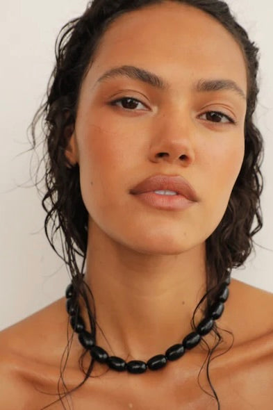 The Clementine Necklace — a strand of smooth resin beads finished with a sculptural gold-plated S-lock, the piece embodies effortless elegance with a contemporary edge.