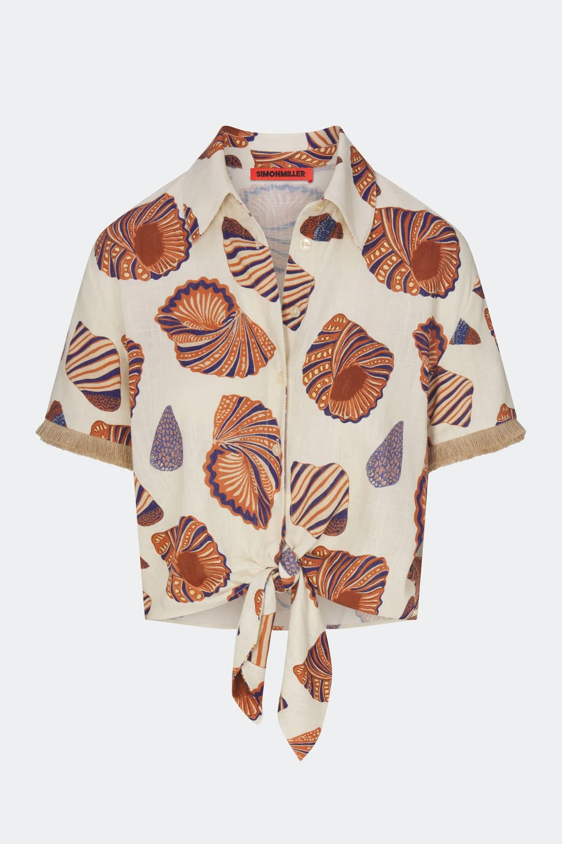 Lightweight linen camp-style shirt with a classic collar and adjustable front tie. Finished with natural jute fringe at the sleeve cuffs and extended sleeves for a relaxed, textural feel.