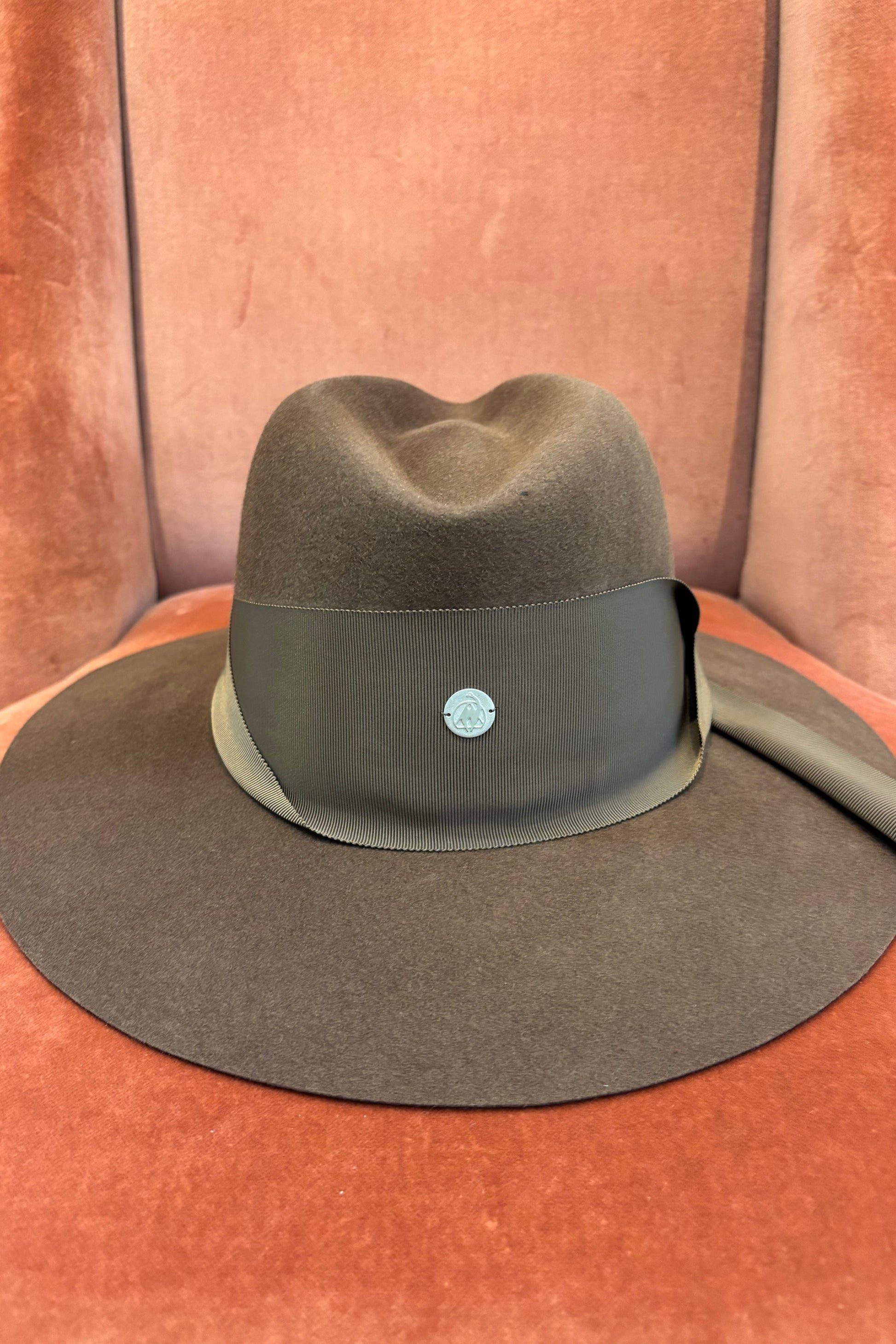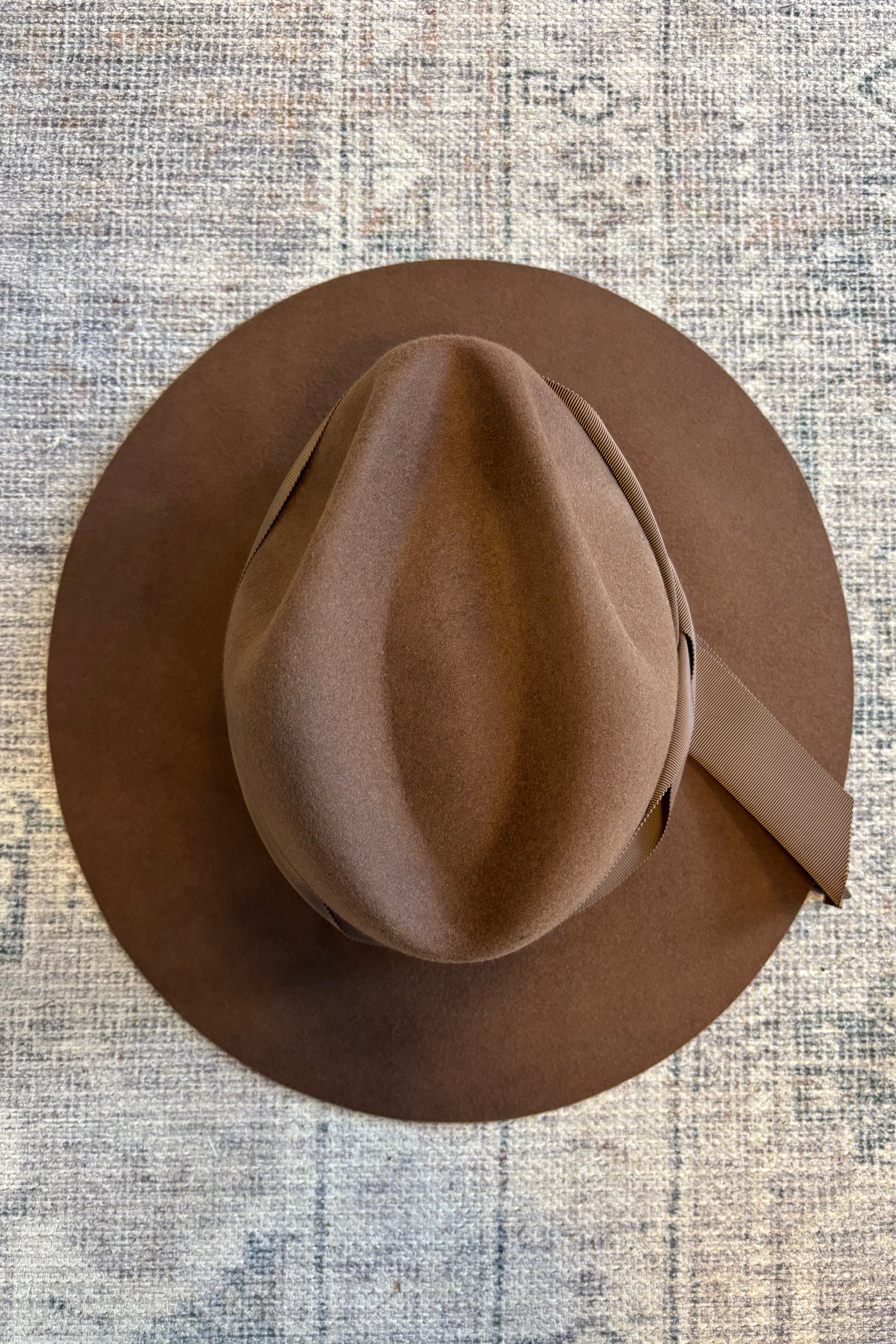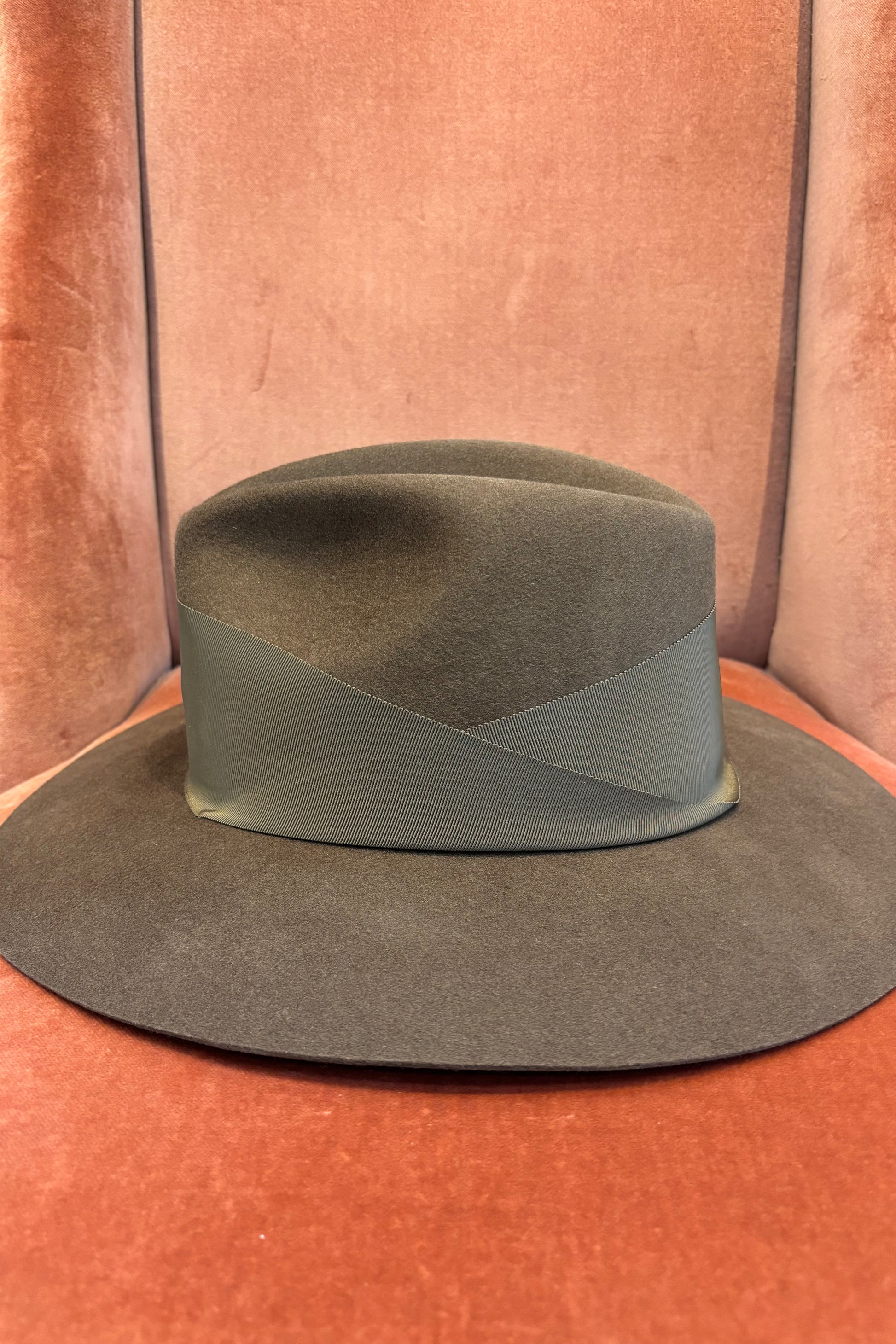 - A structured fedora accented by oversized grosgrain ribbon, wrapped asymmetrically around the hat and finished with a modern, angular fold.