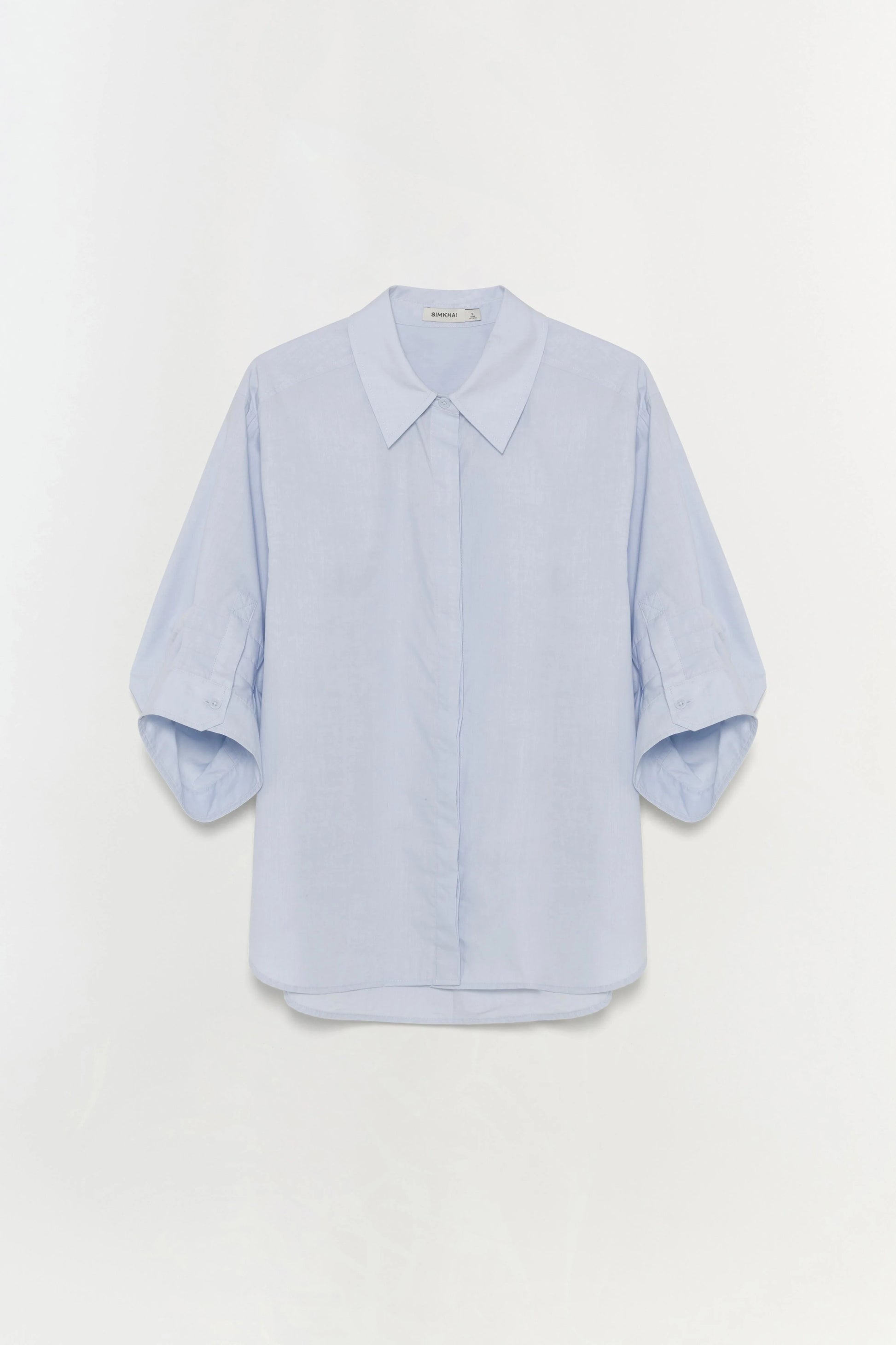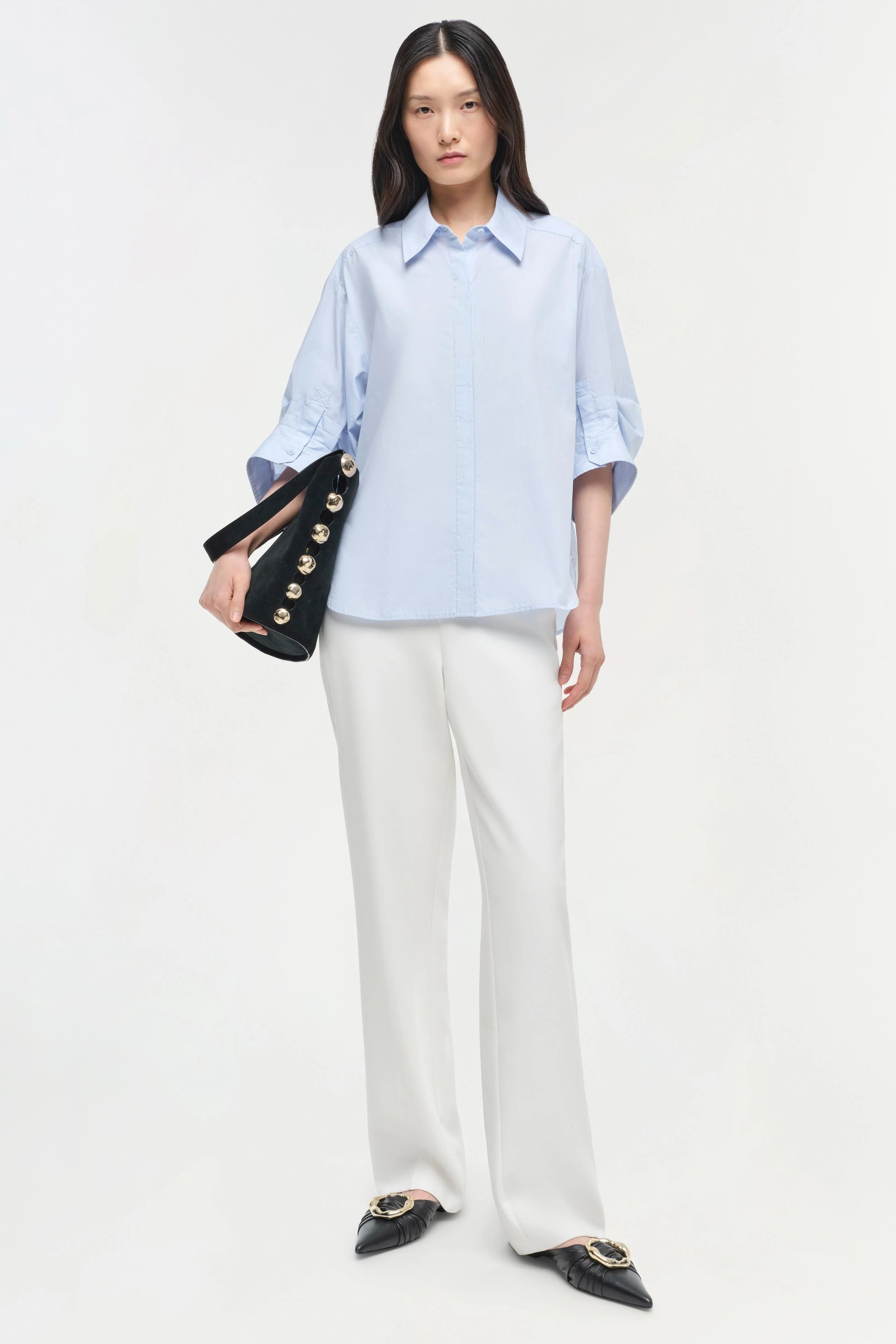 An unanticipated button front top with a spread collar and roomy sleeves that hit just below the elbows.