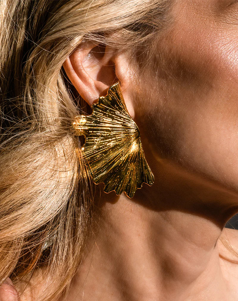 Hand-sculpted earring inspired by natural ginkgo leaves. Dipped in 14k gold. As worn on Drew Barrymore on The Drew Barrymore Show.