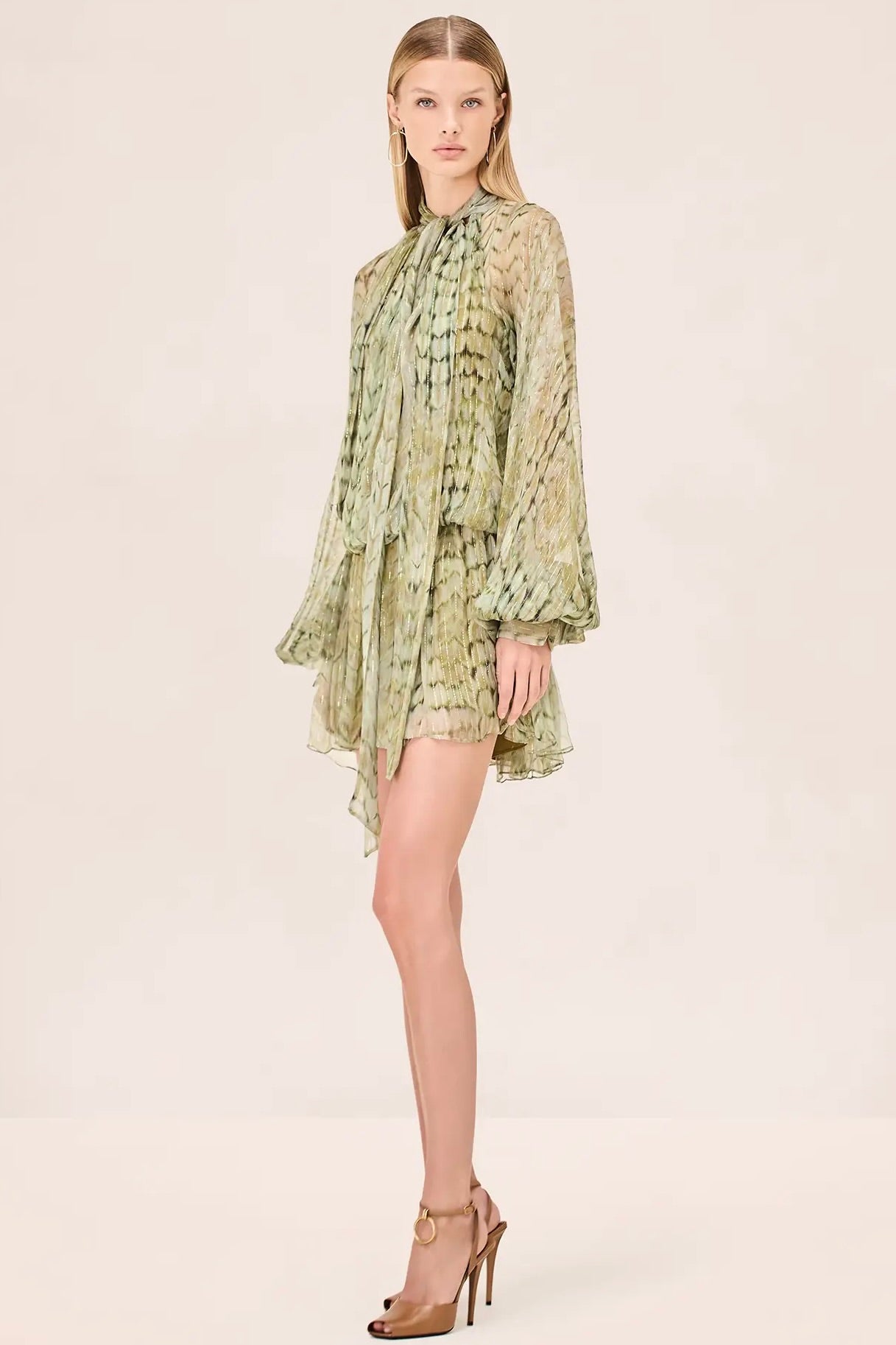 The Hailey Dress is a long sleeve mini dress featuring a sheer pleated overlay, scarf neck tie, and an elastic waistband.