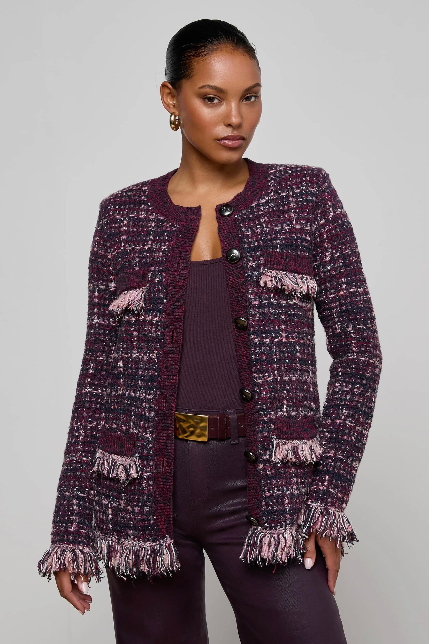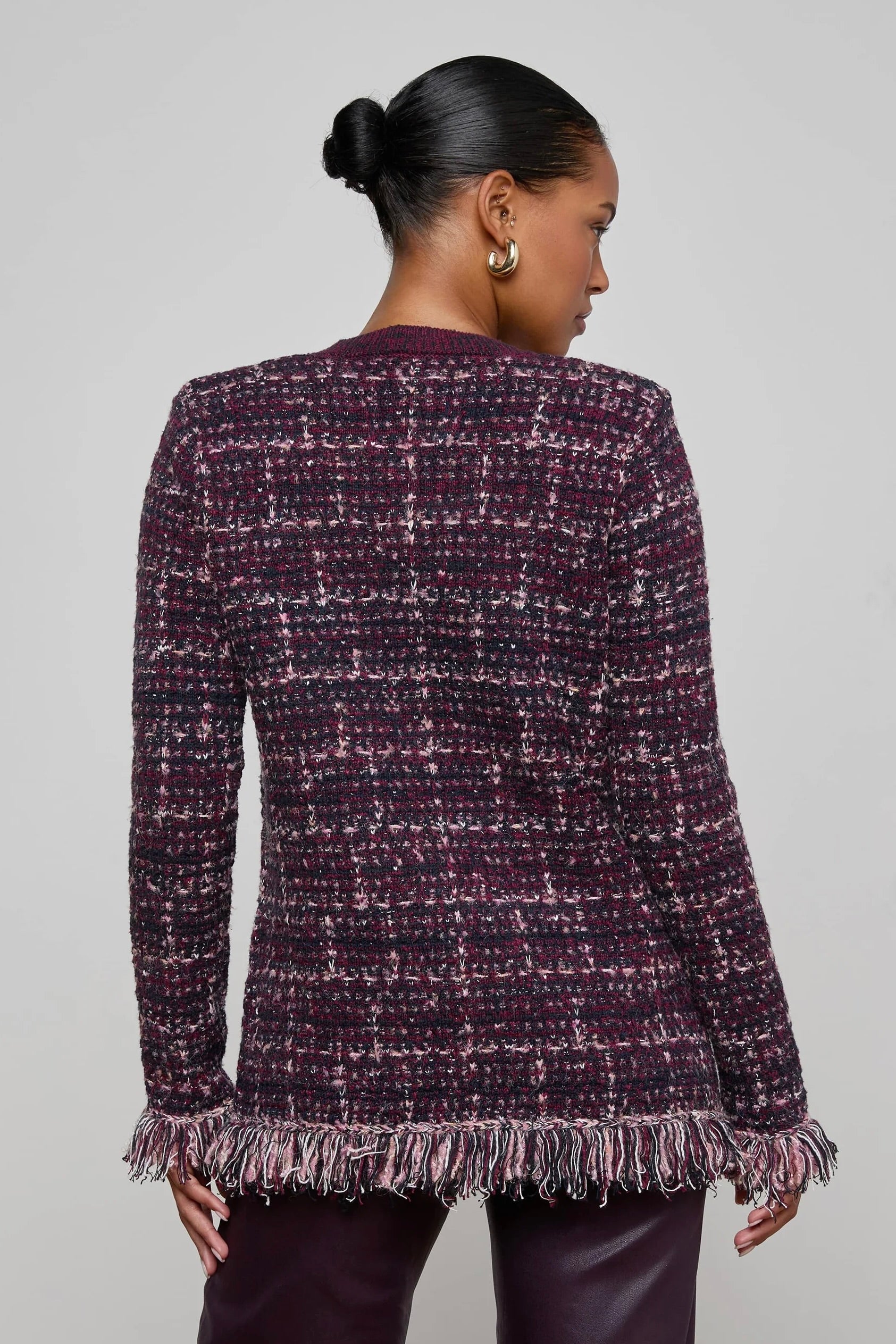 Knit with a mix of textured yarn to deliver the look of a boucle tweed, the Kastoria offers a dimensional look that reads both timeless and fresh. The longline silhouette is finished with bold buttons. This standout layer that works just as well with denim as it does with tailored separates.