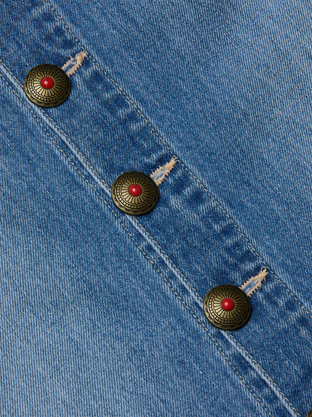 The classic pencil skirt gets a Western update in denim and novel buttons new to Spring ’25.