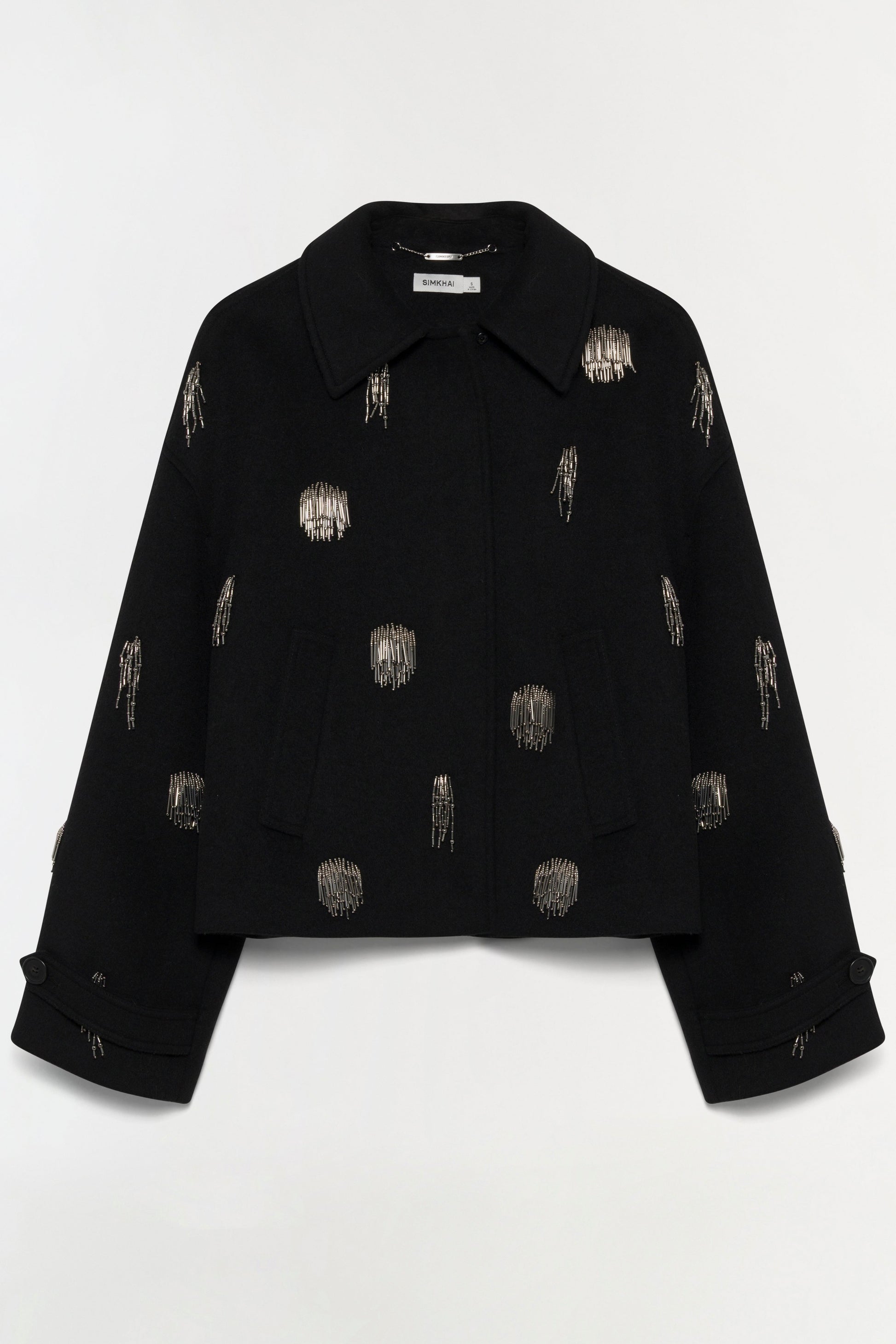 Cut from double faced wool, this jacket is spotted with hand-stitched cascading beadwork. The cropped silhouette sharpens the jacketÕs bold presence, balancing clean tailoring with hand-finished artistry. A statement piece that turns craftsmanship into modern ornament.