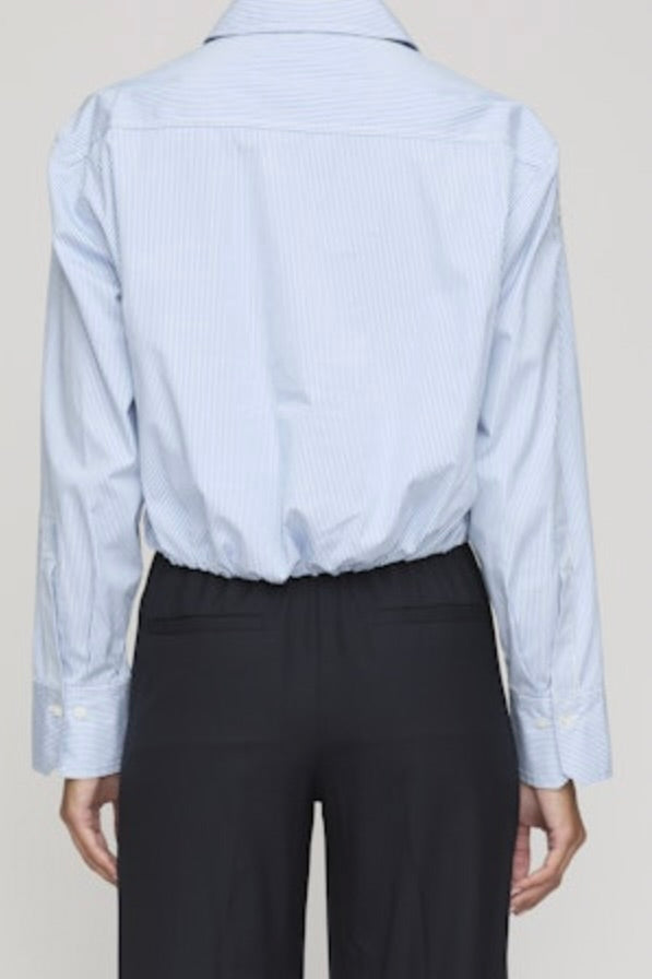 The Leo Top is crafted from end-on-end Thomas Mason shirting fabric in a shade of French blue with white stripes.