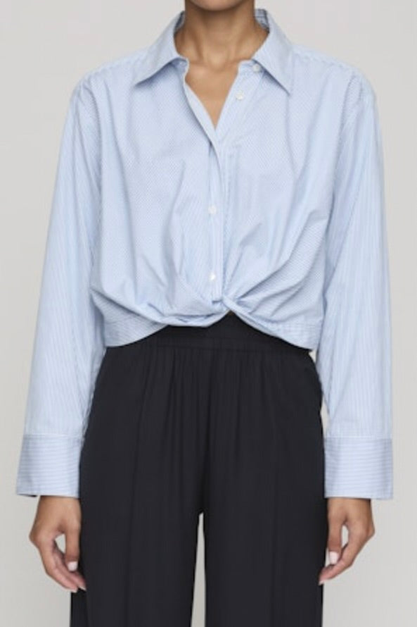 This cropped button-down silhouette features a sharp collar, convertible long sleeves, and a twisted hem detail that hits at the navel for a relaxed, modern shape.