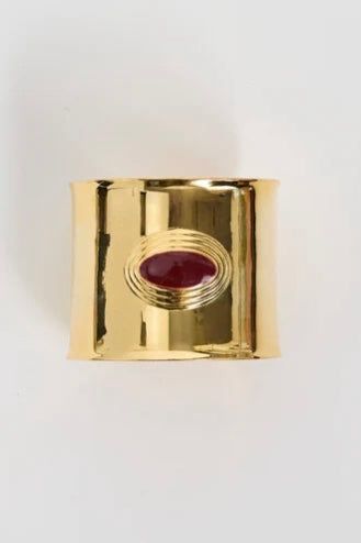 The Matilde Cuff embodies modern elegance with a bold, architectural form. Crafted from stainless steel and available in gold or silver finish, it features a deep burgundy enamel center that adds a striking note of color and depth.