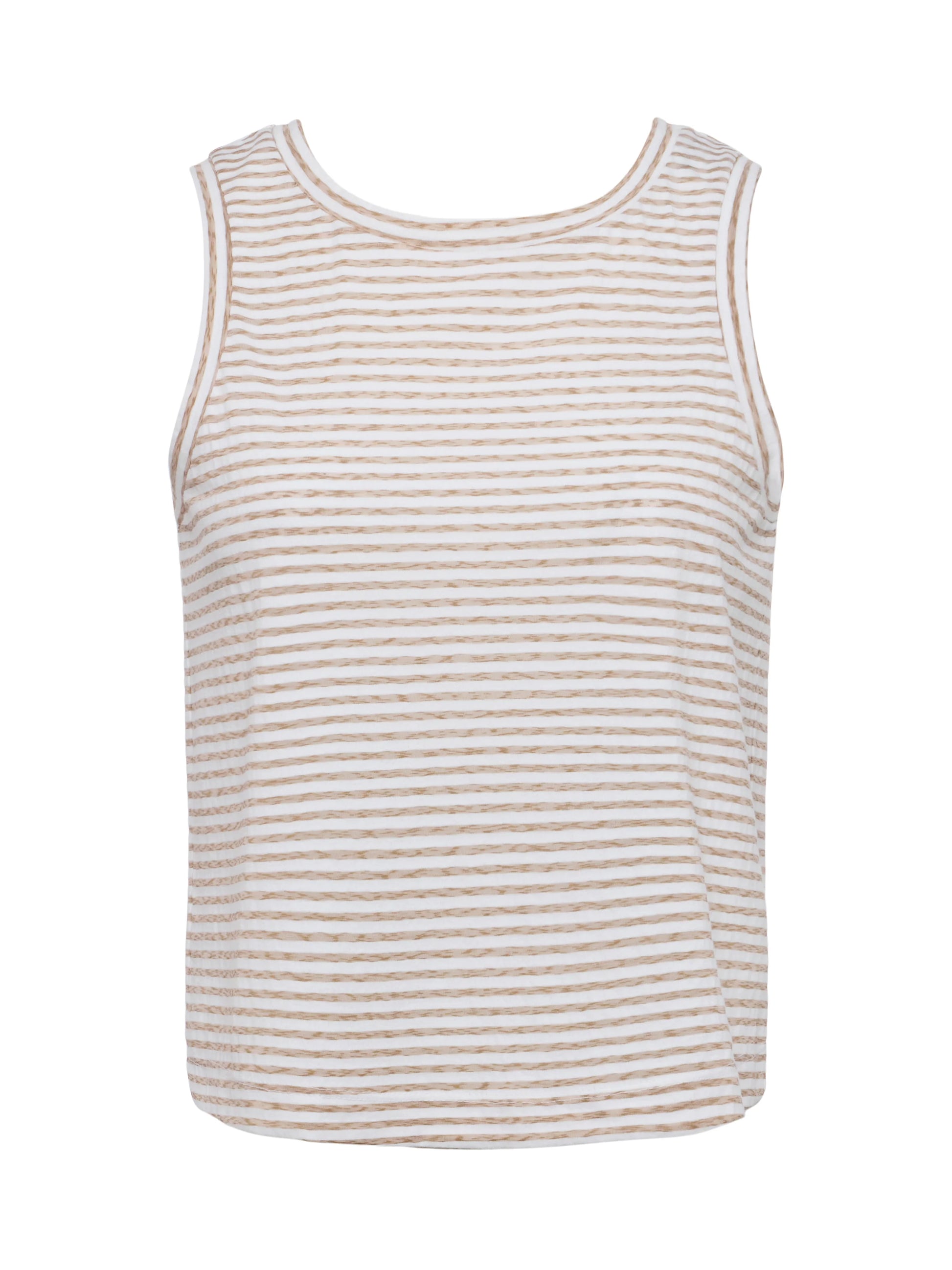 A closet staple and ideal base layer. Our essential sleeveless tank is back in white with tan stripes.