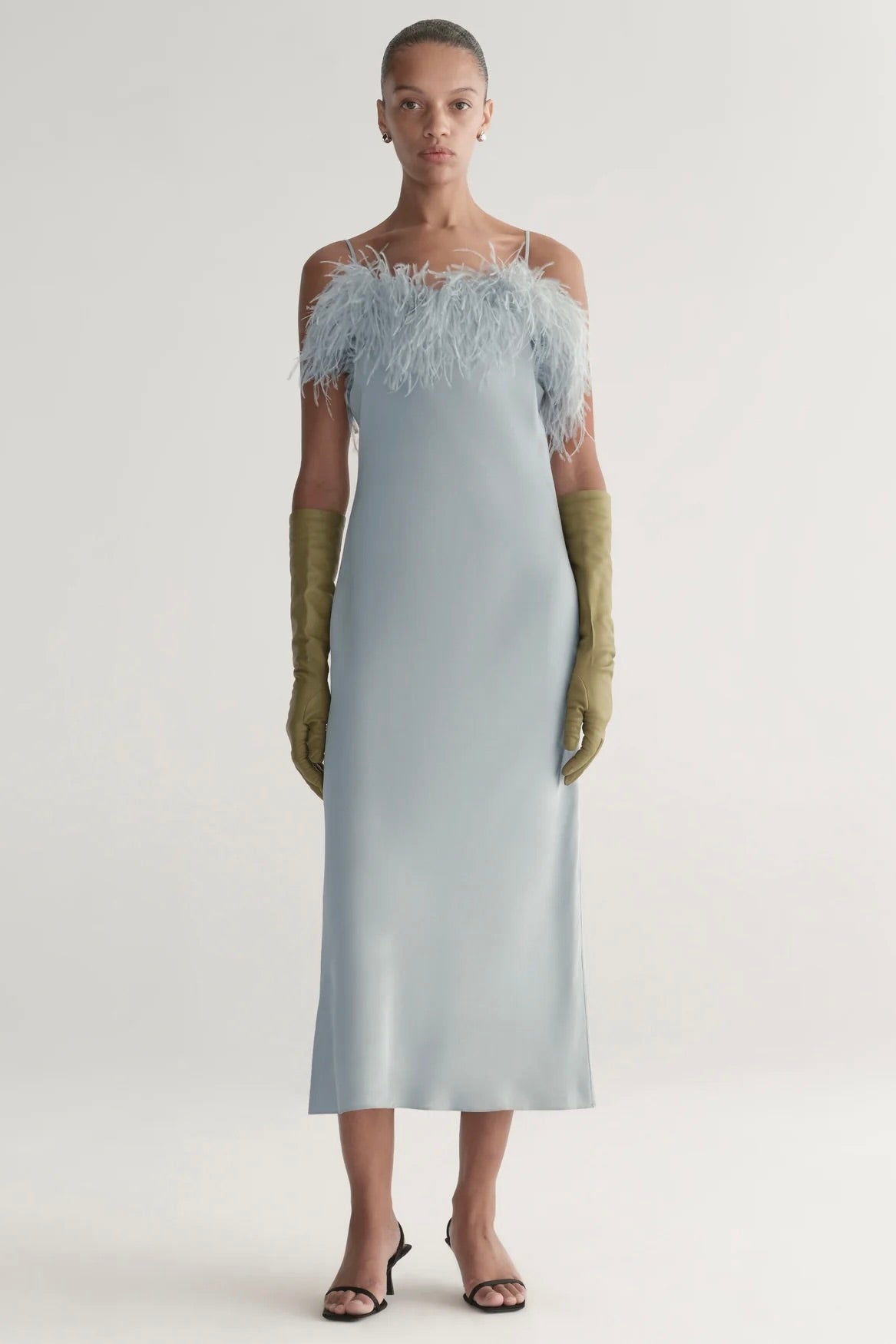 Modern, minimal, and distinctly festive, the Odette Dress elevates the classic slip with subtle feathered detail. Sleek, sculptural lines and ostrich feather detailing create a unique statement for holiday evenings. Crafted from Japanese crepe-back satin, this midi-length silhouette skims the body with weight and drape for an effortlessly refined fit.