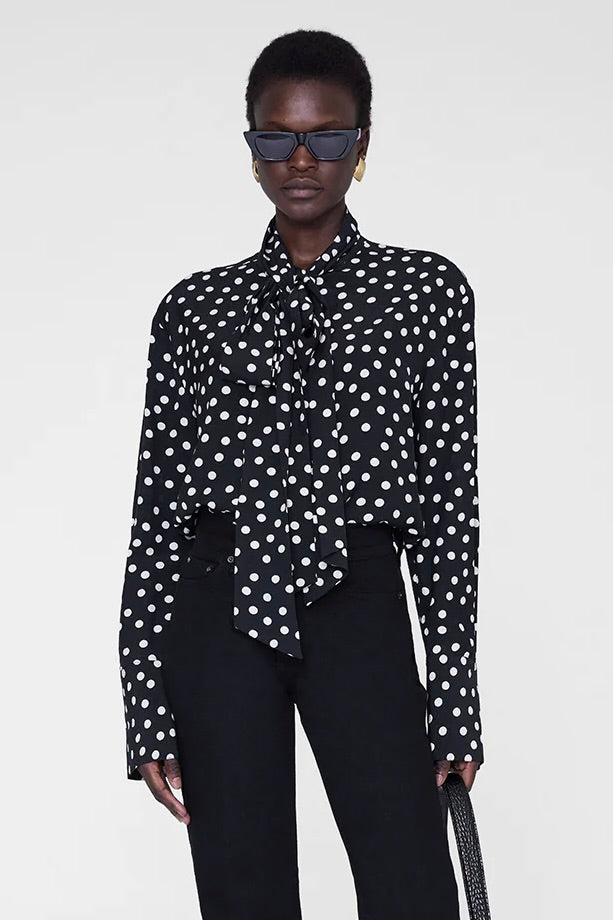 The Ruby Shirt is a flattering, high-neck style made in a double-dot jacquard print.