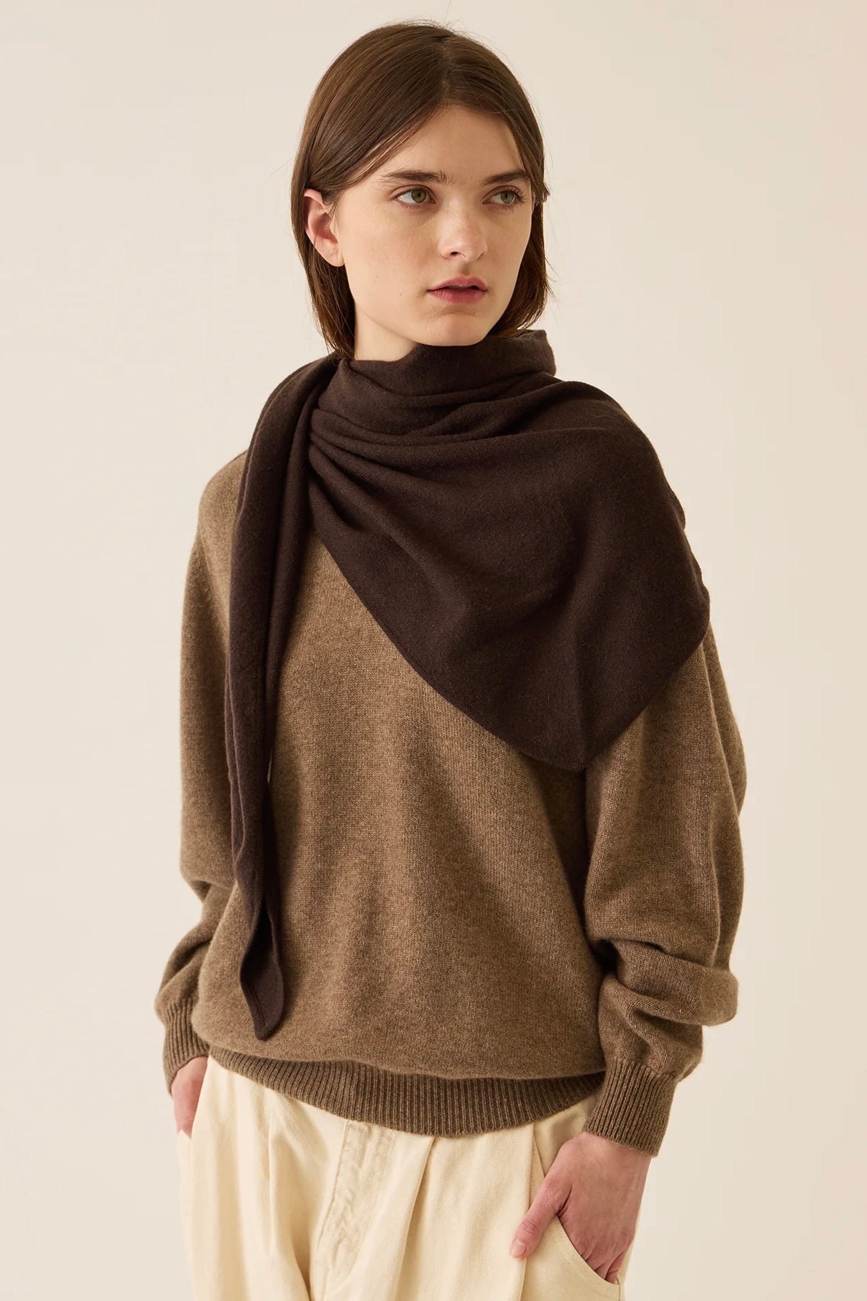 An oversized knitted cashmere bandana scarf that can be styled and worn in multiple ways.