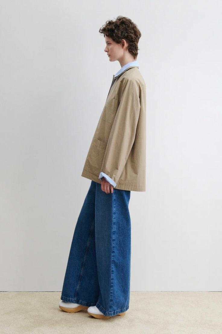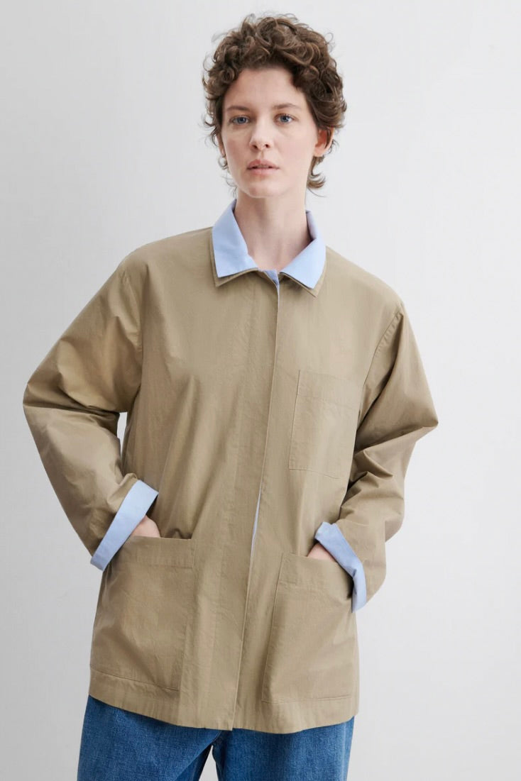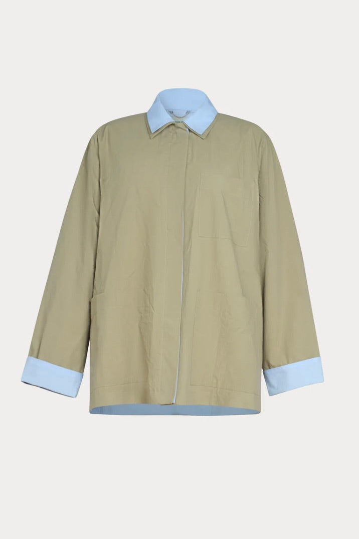 Reversible long-sleeve top designed with a relaxed, boxy silhouette and clean, utilitarian lines. Features a collar and cuffs with contrasting double-layer panels, as well as a button-front closure on one side and concealed buttons on the other. Constructed with oversized patch pockets and cut from RC classic Organic Crisp poplin—a smooth, durable plain weave with a dry, crisp hand and subtle sheen.Â