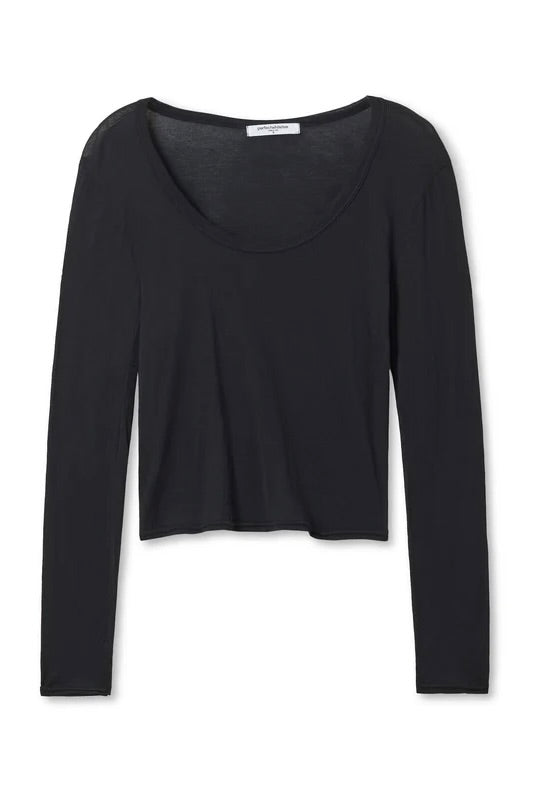 the angie top is part of our light french jersey collection, designed to fit close to the body with a flattering u-neckline. featherweight and softly sheer, it’s made to feel sleek and modern, whether styled on its own or layered under your favorite pieces. creates a more vintage look after each wash.