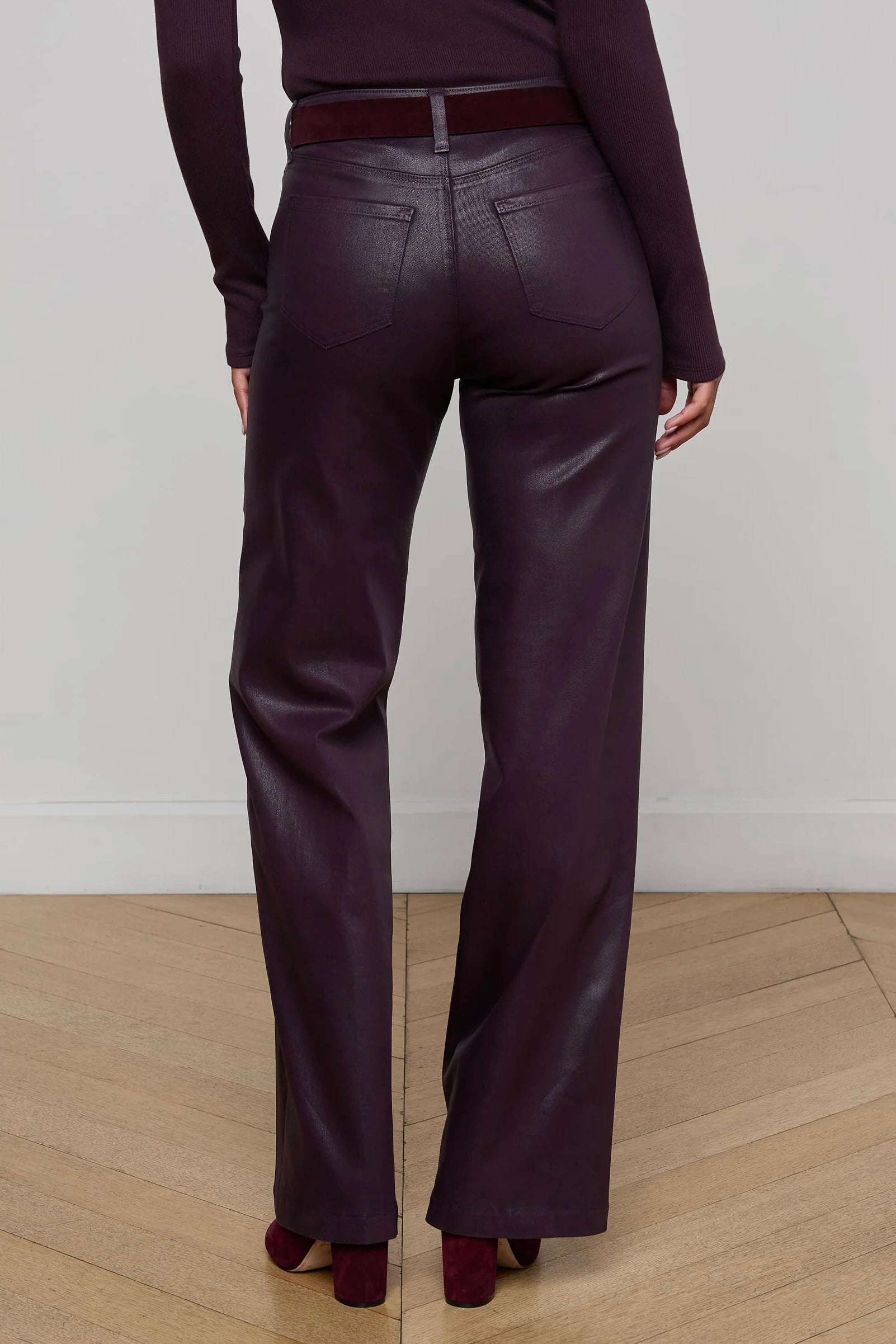 The Scottie is our classic wide-leg jean. This silhouette runs fitted and flattering through the hips and upper thigh before releasing to a relaxed wide leg. A contoured waistband sits securely at the natural waist without gaping. Now in dark malbec leather-look coated denim.