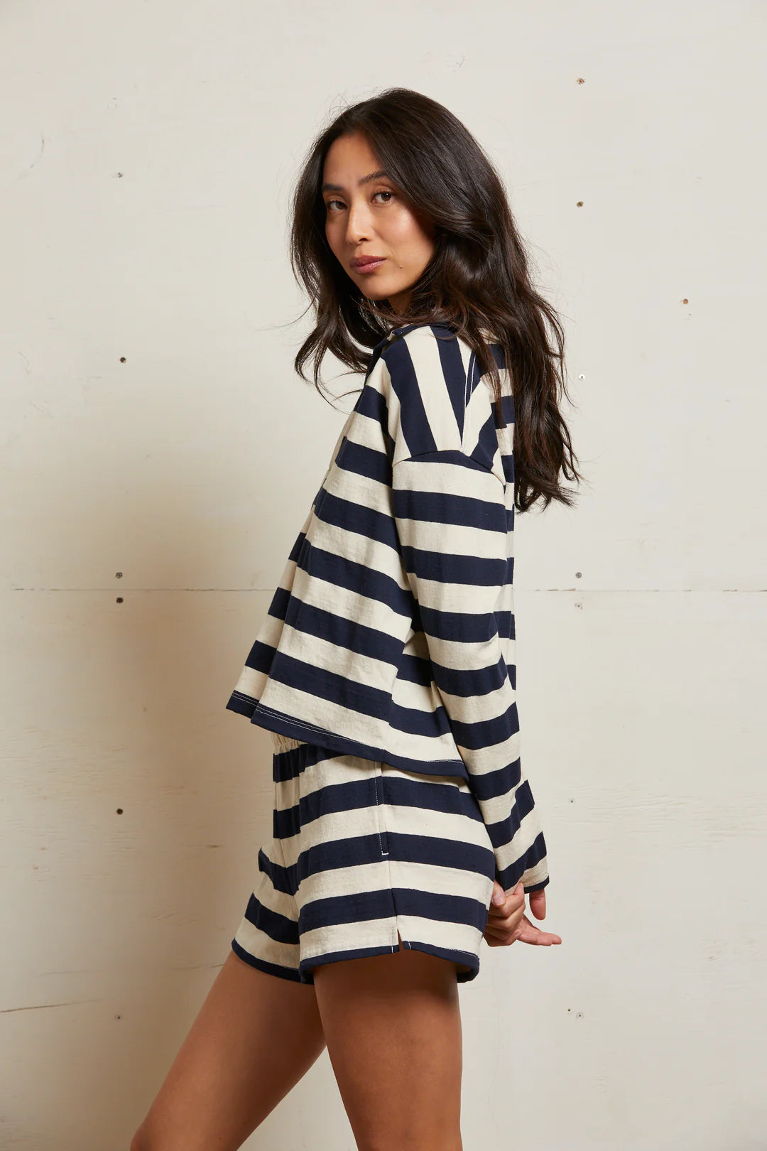 elevated and cool with a lightweight feel. made from our signature tennessee jersey fabric. pair this collared top with our new liz short for the perfect set.