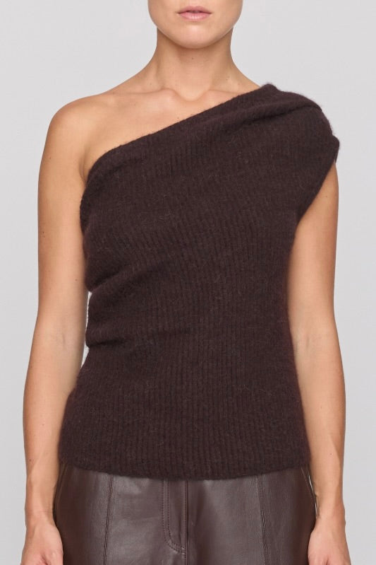 The Sue Top is knitted from a brushed alpaca and merino wool blend, offering soft texture and elegant warmth. Designed in a charcoal hue, the asymmetric silhouette features a one-shoulder neckline and subtle draping that creates fluid movement and dimension.