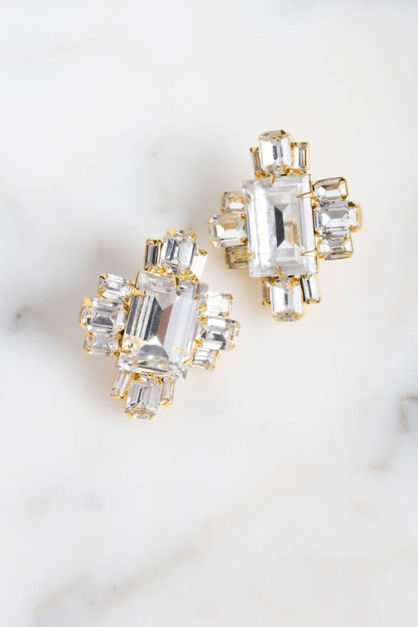 The Thalira Earring features a striking emerald-cut crystal as its focal point, elegantly flanked by three smaller emerald-cut stones in a balanced arrangement. The clean lines and sharp facets of this design create a contemporary yet timeless silhouette, offering versatile sophistication for any occasion. Ideal for those who seek jewelry that speaks through understated refinement and architectural beauty.