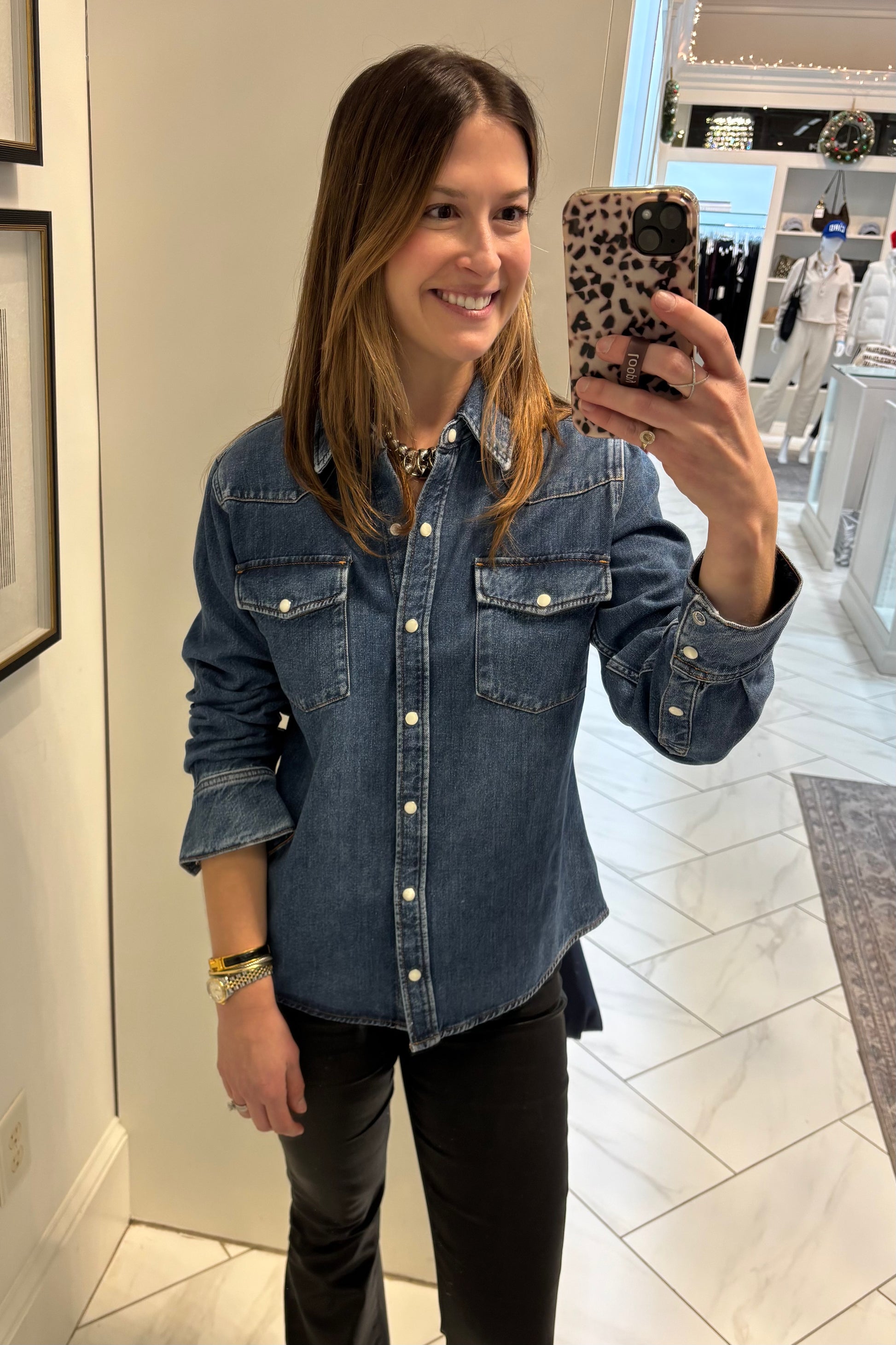 A classic rigid denim shirt with Western-inspired, pearl-finish snaps. Slim cut for a fitted look.