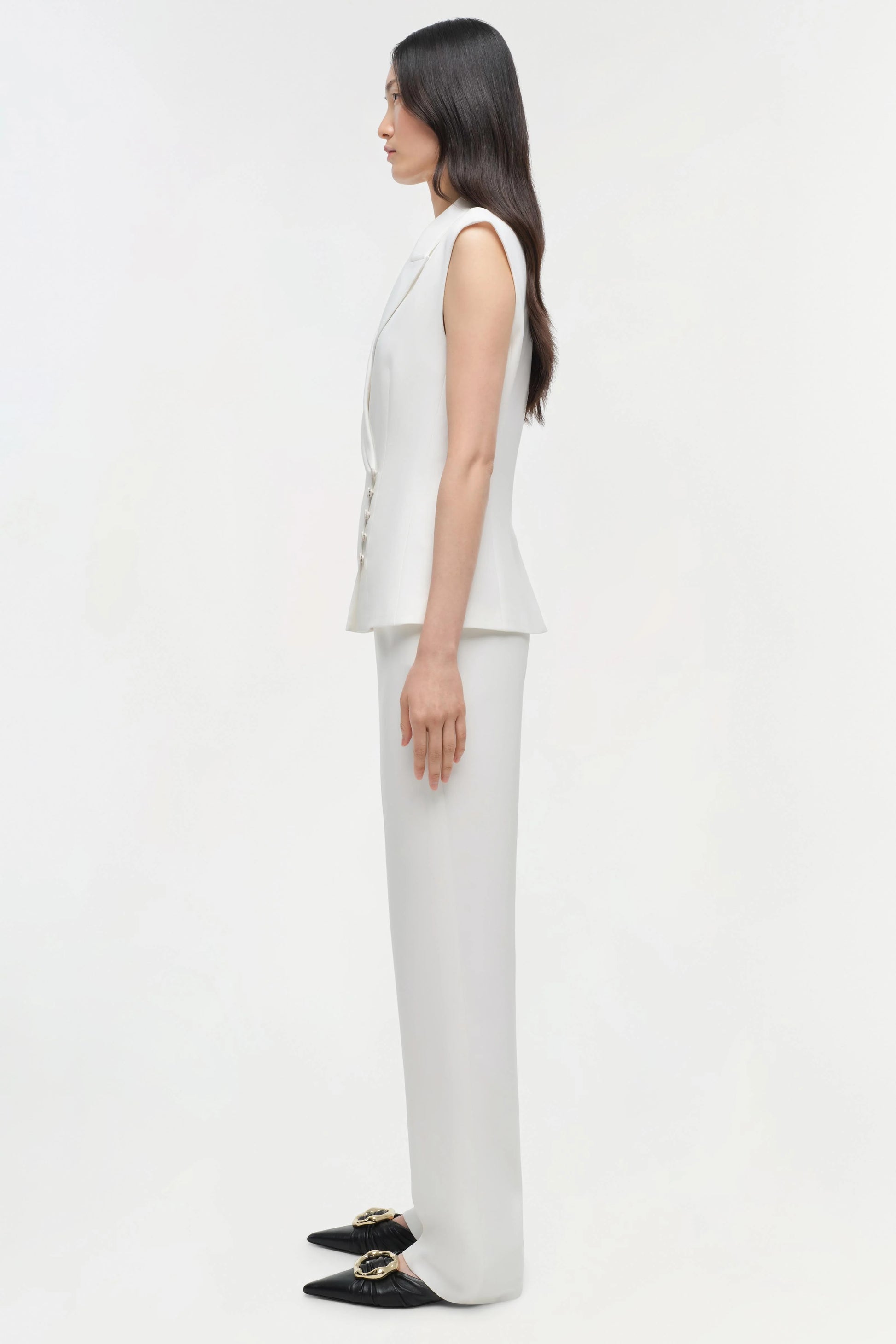 A polished vest that rethinks the classic blazer with an crossover front and asymmetrical side button closure. Notch collar, side front flap pocket.