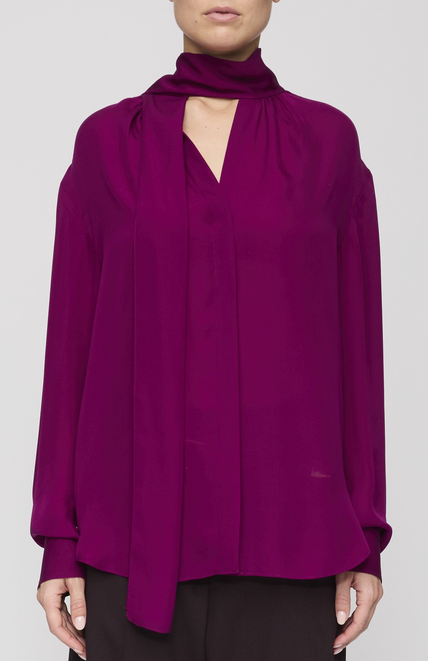 Rendered in a vibrant jewel tone, this tie-neck blouse is crafted from silk and features elegant gathering at the back placket. The versatile silhouette can be worn undone or with a strap draped over one shoulder.